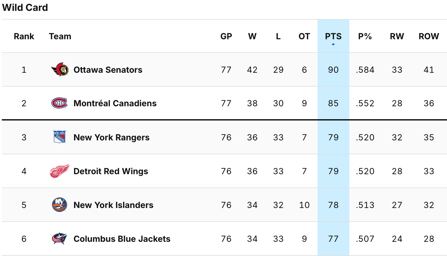 †Note: Sens have not mathematically clinched, the 100% above is due to the simulation nature of MoneyPuck odds. Sens would need to go 0-5, Detroit would need to go 6-0, and Habs would need to go at least 3-2 for Sens to miss playoffs.