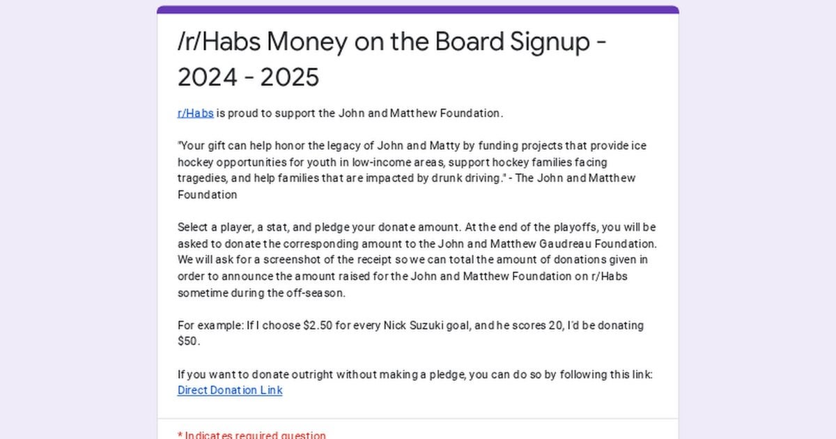 We are bringing back the r/Habs Money on the Board! Make a pledge, follow the team throughout the playoffs, and donate to the John and Matthew Gaudreau Foundation, to honour the memory of Johnny and Matthew Gaudreau.