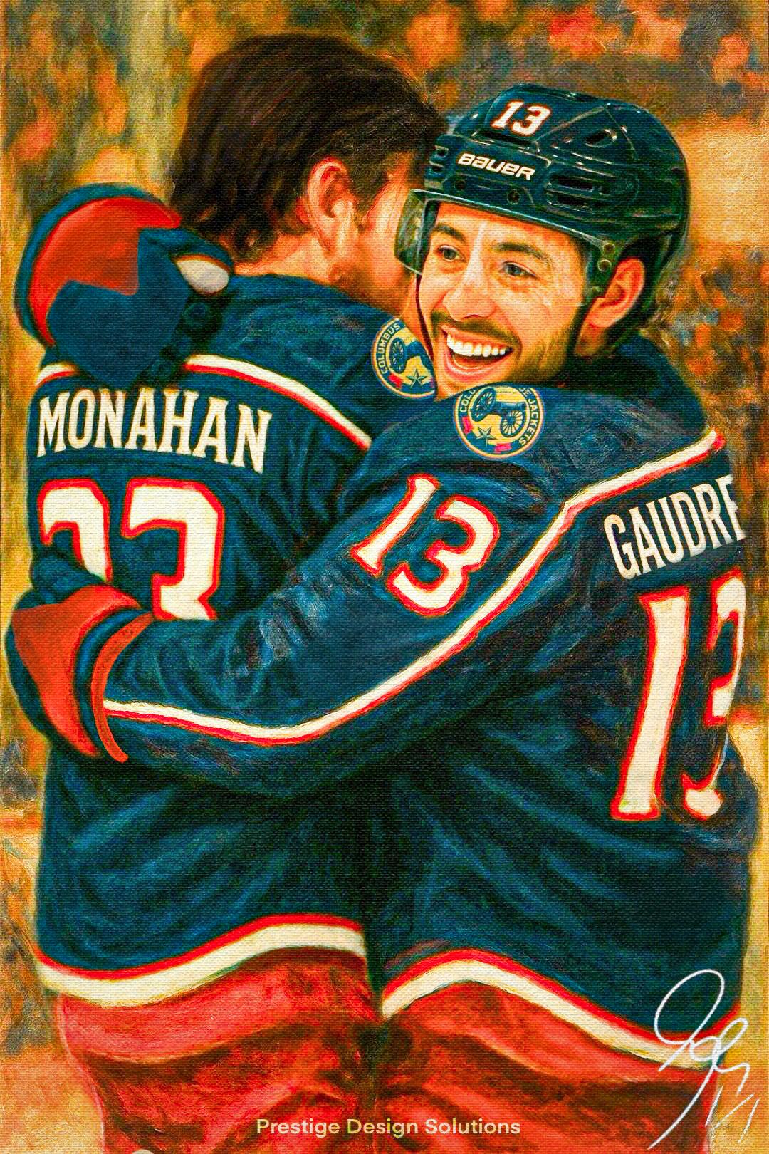 This piece represents a moment shared between John Gaudreau and Sean Monahan — one last hug as teammates. John and Sean had so many amazing memories together in Calgary, but I can only think of the amazing franchise records those two would have broken if they had a chance to get on the ice together in Columbus. I felt this piece needed to happen. I created it after several heartfelt requests and also following the overwhelming love 13 Minutes Of Silence received from the 5th Line and the Blue Jackets Organization. I had no choice but to make this piece a personal gift for Mony from all of us fan's.