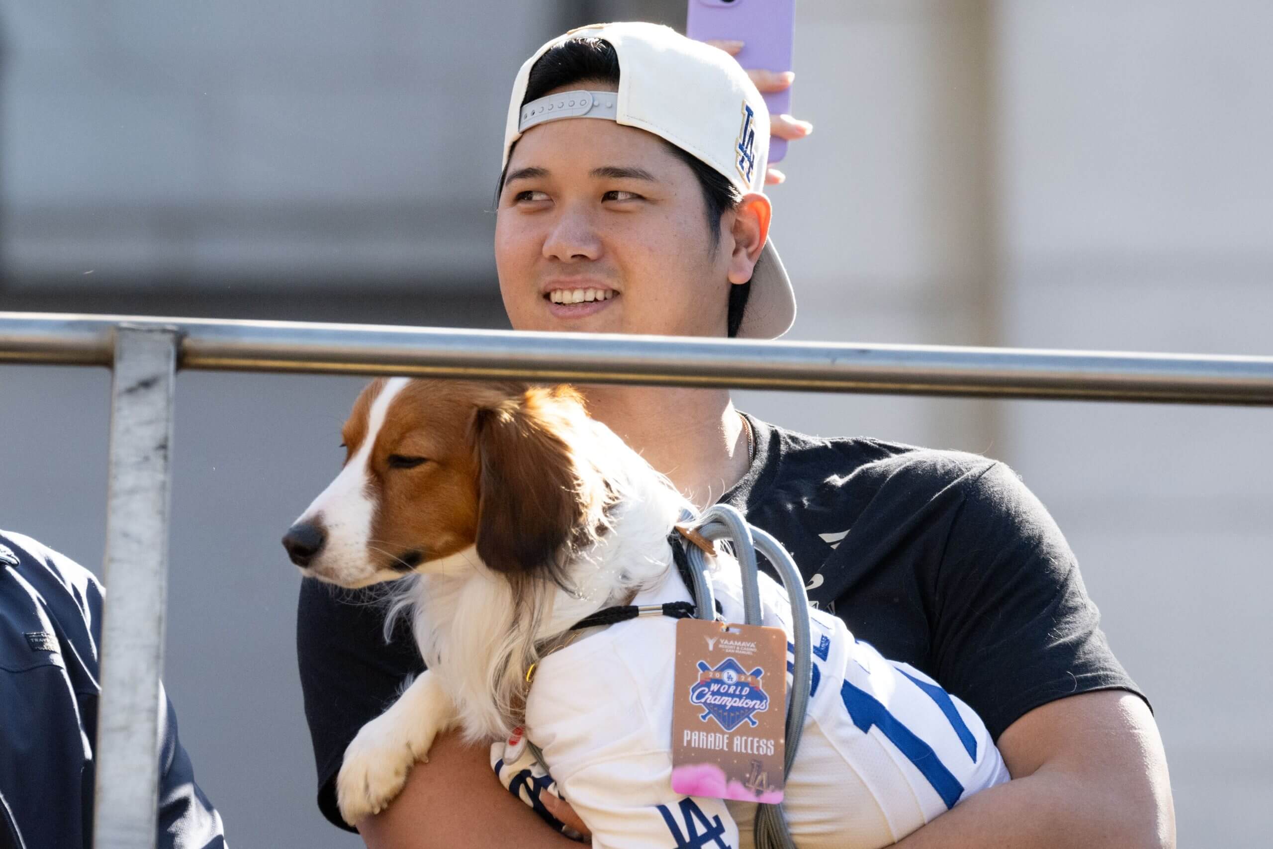 Shohei Ohtani celebrates at the Dodgers’ World Series parade with his dog, Decoy. (David Crane / MediaNews Group / Los Angeles Daily News via Getty Images)