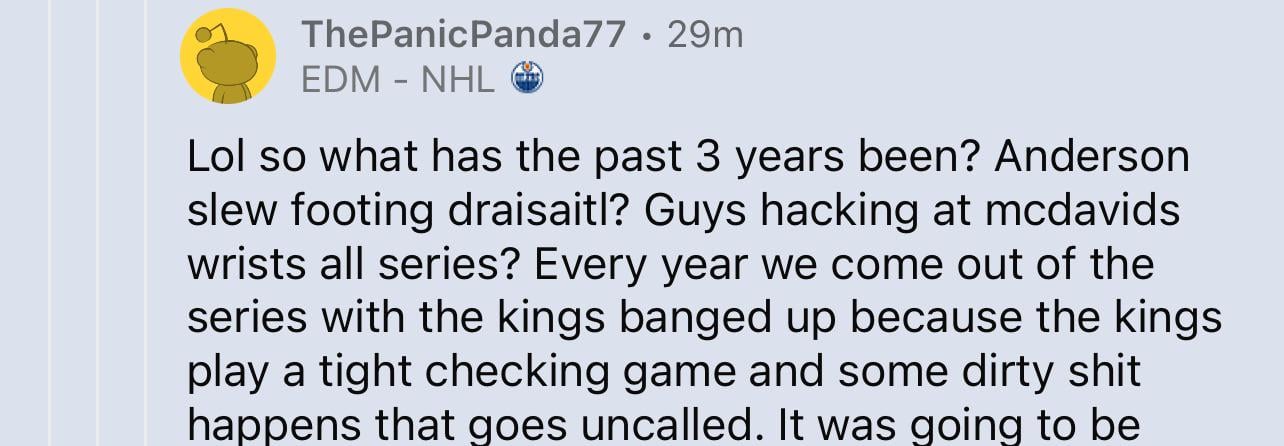 They very conveniently forgot Nurse head-butting Danault, or McDavid boarding Mikey. Their grandiose delusions and entitlement don’t even upset me anymore.