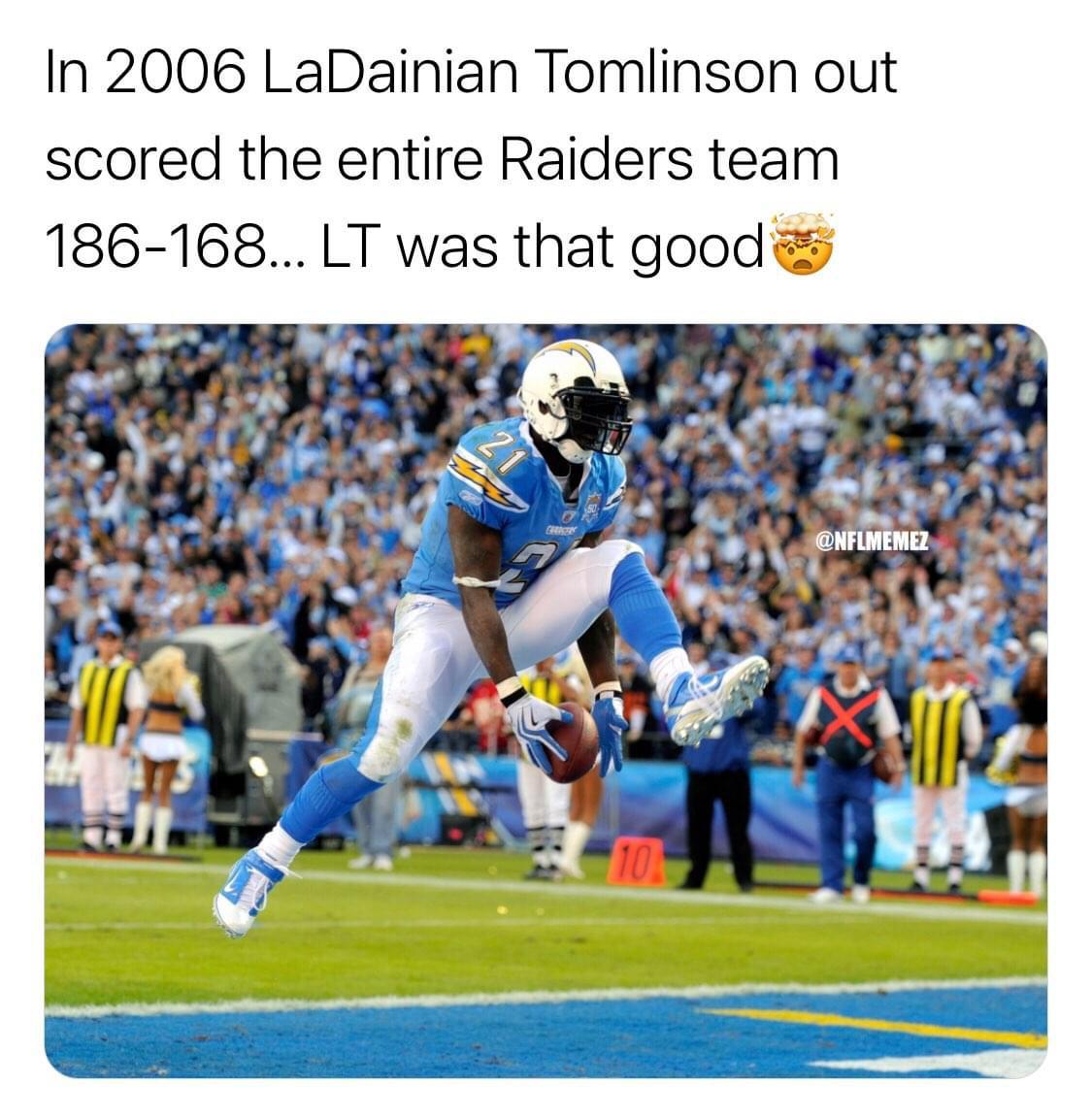 I always like to bring this up whenever LT and Raiders are mentioned: Between 2003-2008 LT average 132 yards per game against the Raiders. He’s the Raider Killer.