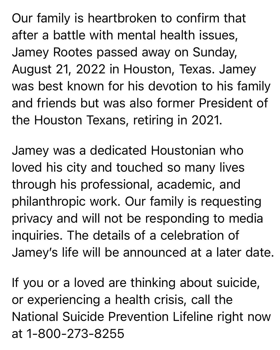 Melissa Wildgen Rootes, wife of former Texans President Jamey Rootes, posted the following about her late husband tonight on Facebook: pic.twitter.com/b66SCnS5FO