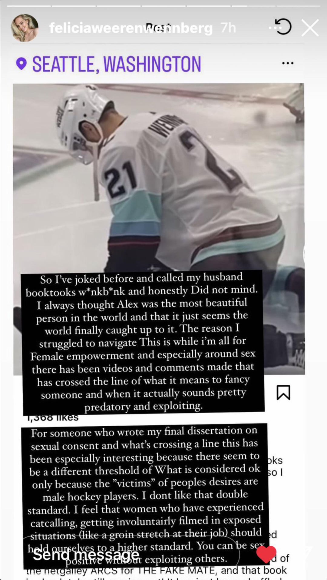 Reminder also that the Seattle Kraken tiktok admin has been encouraging this shit for a while posting videos for the thirsty booktok community and invited the woman who shares most of this stuff on TikTok, Kierra Lewis, to a game with the sign “Krack my back” in front of everyone, including players’ families. She commented the same thing on Vince Dunn’s instagram multiple times too.