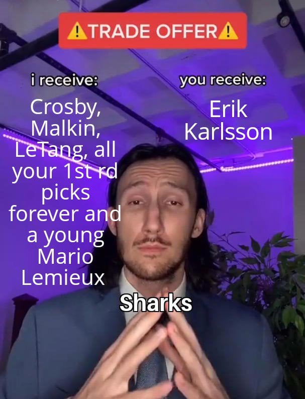| 268 | [67 comments](/r/penguins/comments/15b179q/what_does_san_jose_want/) | [What does San Jose want?](https://i.redd.it/2fzj56z79ieb1.jpg)|
