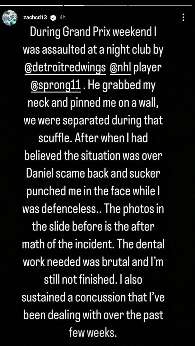 Canadian race car driver Zach Claman DeMelo alleges he was assaulted by Red Wings player Daniel Sprong in an Instagram story post.