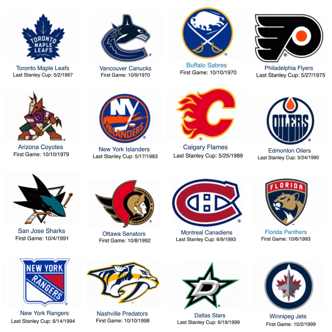 I did this last year at about the same time last year and another team has hoisted Lord Stanley’s Cup. Same as last time, longest drought is first and if a team has never won a Cup I have listed their first game in the league. If a team has relocated, I used their original franchise as a starting point (Arizona/Winnipeg, Winnipeg/Atlanta, etc.)