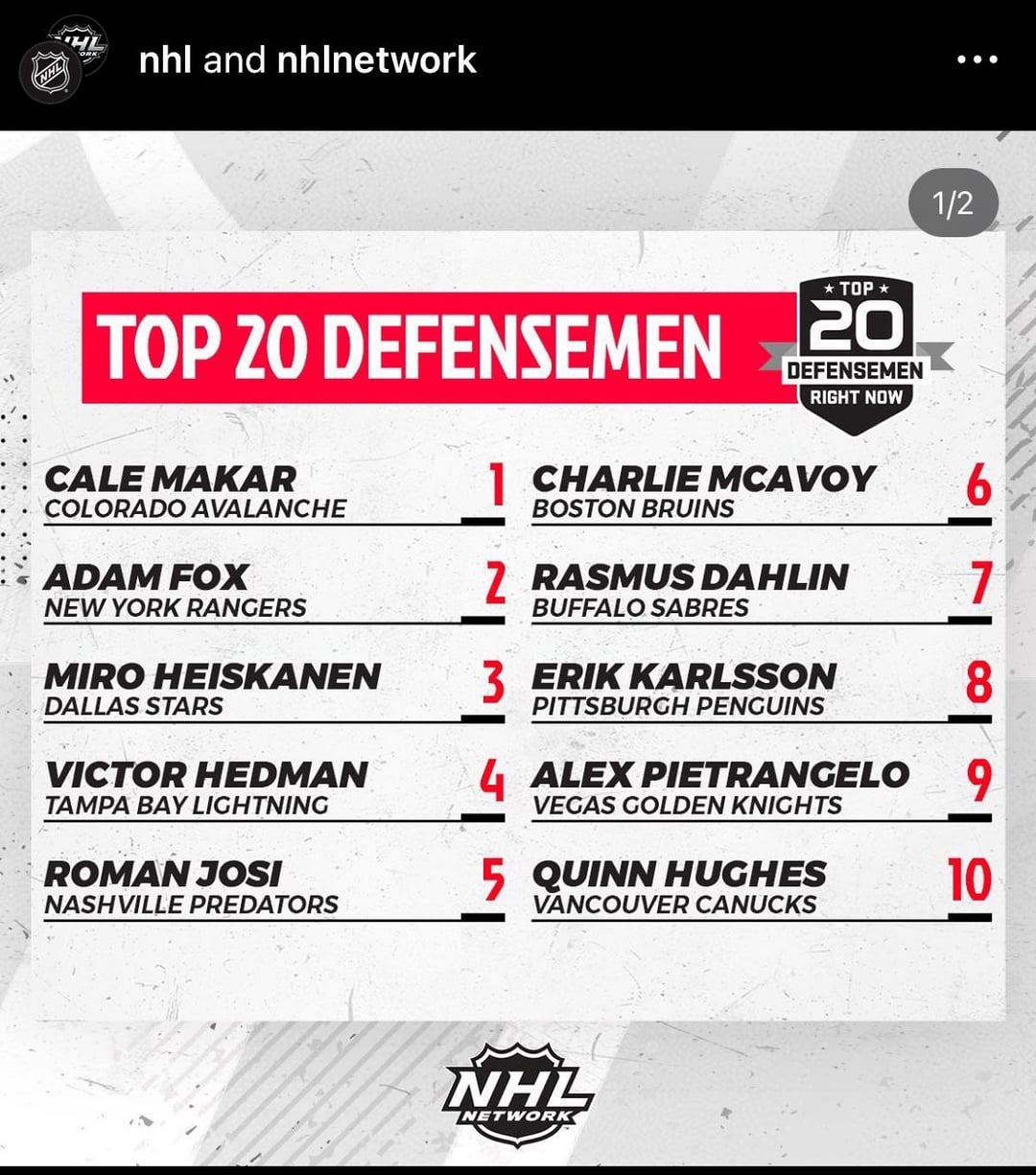 11. I don’t necessarily agree with McAvoy’s placement but I get it, offensively he’s just not on that level of most of these guys even if the rest of his game is debatably the best in the league. He’s probably the most well rounded D-man not named Cale Makar, and defensively and Physicality wise he’s second to few if any. Offensively he’s just meh, he could probably put up 65 in a strong year, usually good for 50ish, so I get the placement.