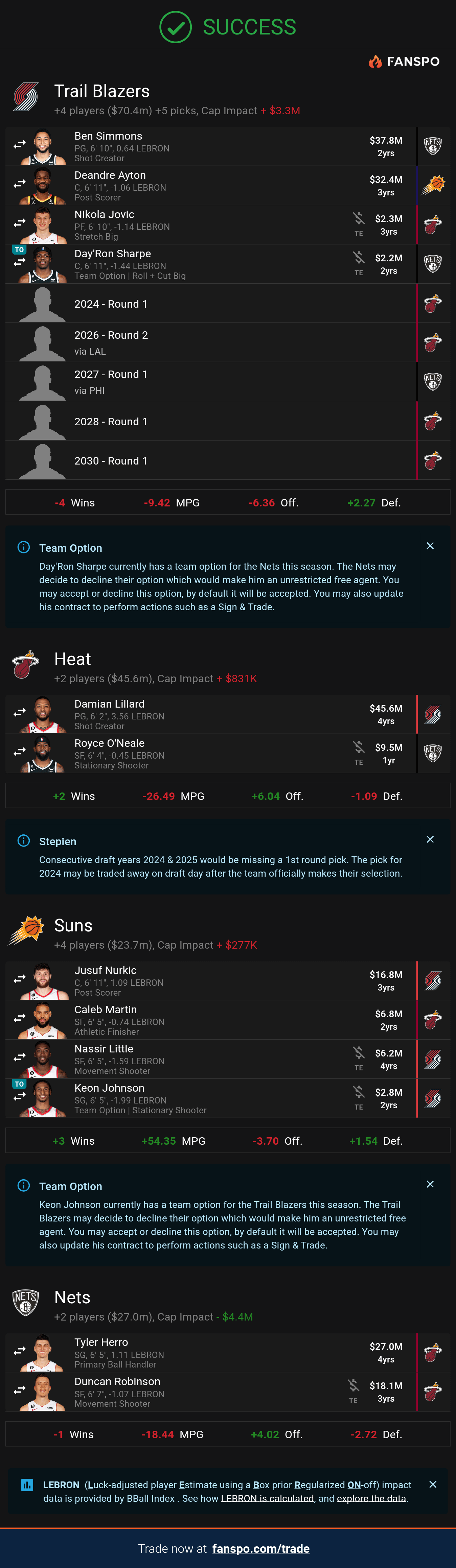 5. In a trade with BKN – The idea of taking Simmons back would be that BKN might actually give up more draft compensation to get off his contract. BKN has better draft assets, so why bother with MIA or PHX, when BKN has a batter asset package for Dame?