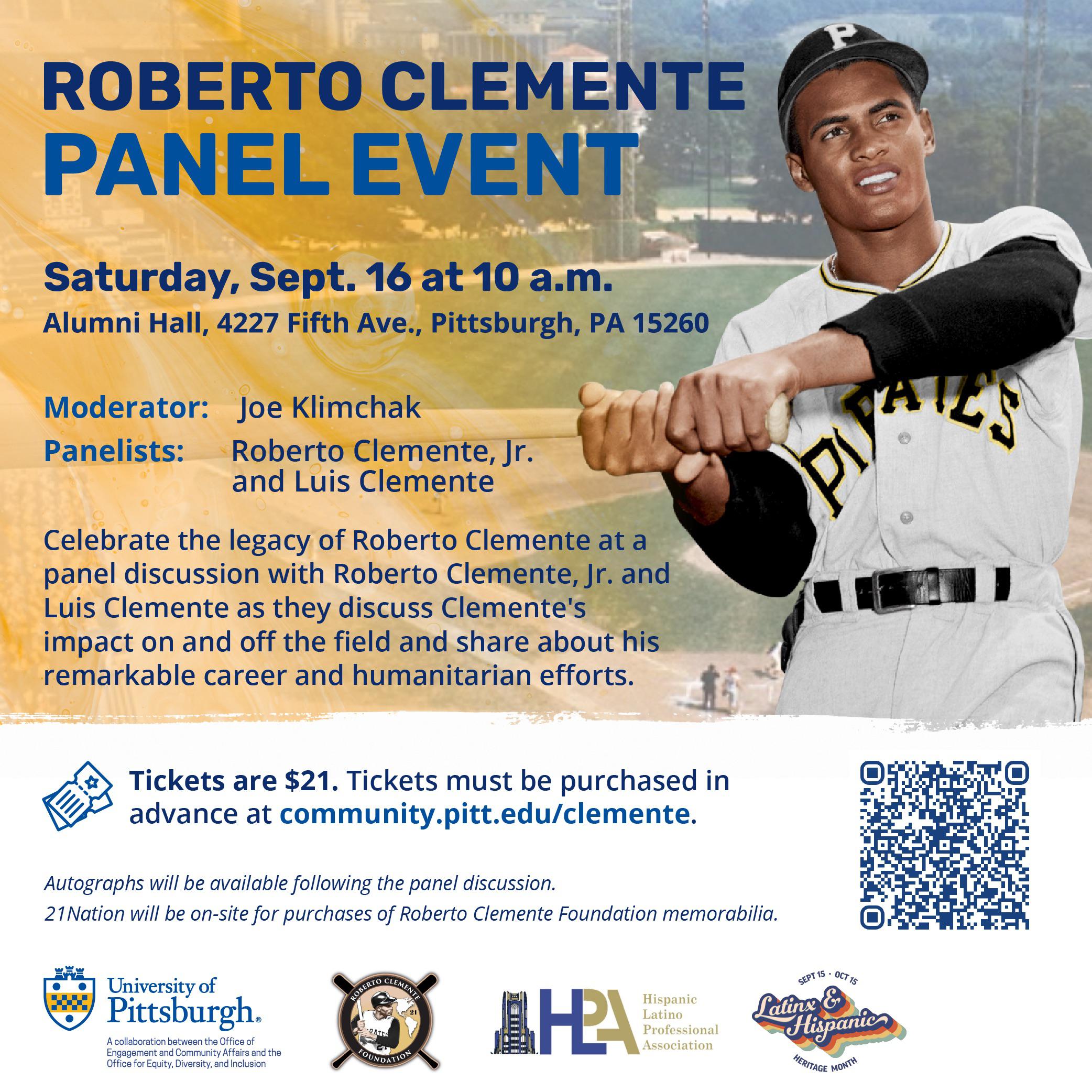 Join the University of Pittsburgh and the Roberto Clemente Foundation for a panel discussion celebrating the legendary Roberto Clemente on Saturday, Sept. 16 at 10 a.m. in Alumni Hall located at 4227 Fifth Avenue, Pittsburgh, PA 15260.