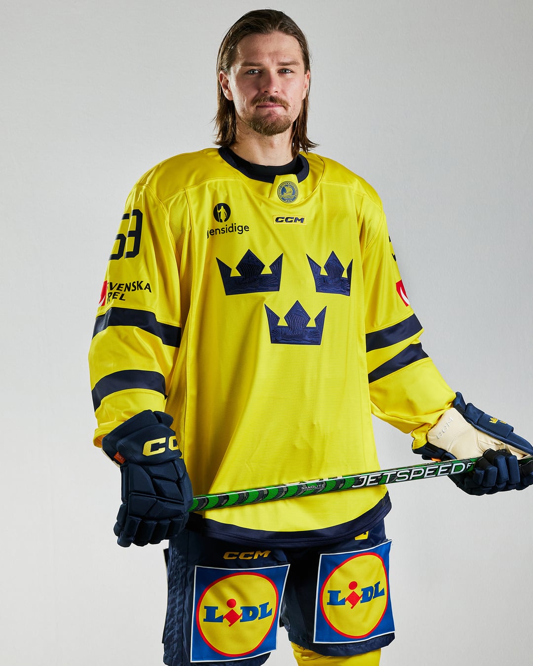 Team Sweden proudly presents a new CCM Home jersey. The yellow jersey features darker blue details and the swedish hockey federation logo has been moved from the chest to the collar similar to the NHL logo shield. Made in Czech Republic. How do you like it?