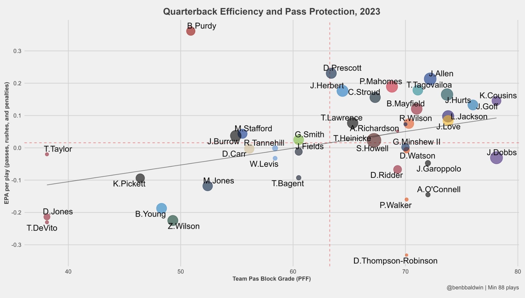 [Lombardi] Brock Purdy is #1 in NFL QB efficiency by a huge margin playing behind a 49ers’ offensive line that ranks #28 in pass-blocking grade. @benbbaldwin ‘s graph shows just how much of an outlier Purdy is: