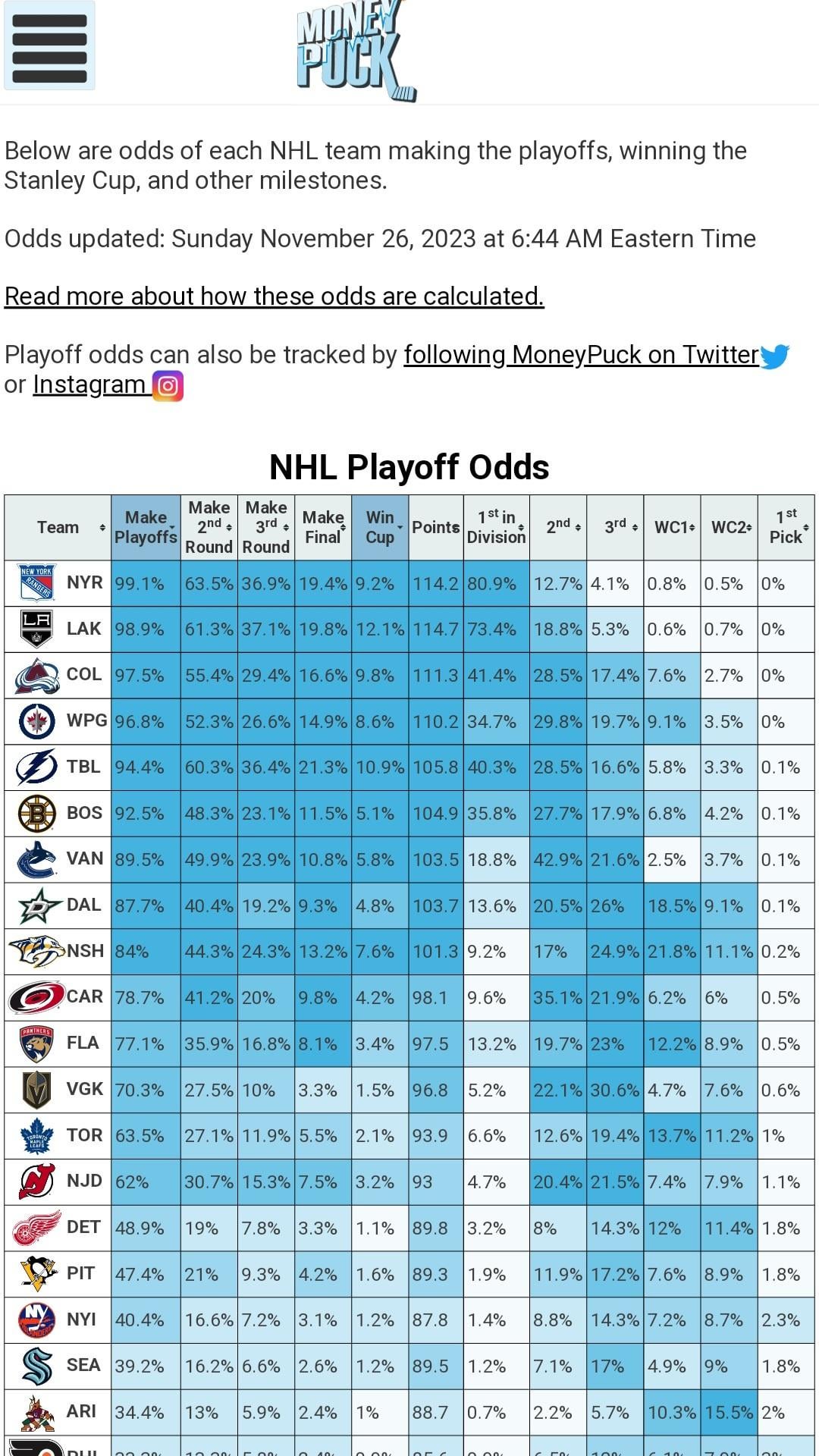 Last year Moneypuck had a team listed with odds less than 100% to make the playoffs. They had already qualified at that point.