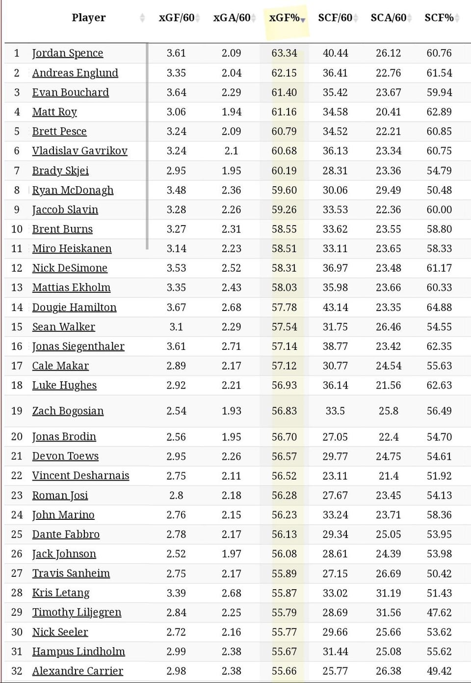 [NaturalStatTrick] Top & bottom 32 defensemen sorted by 5v5 xGF%