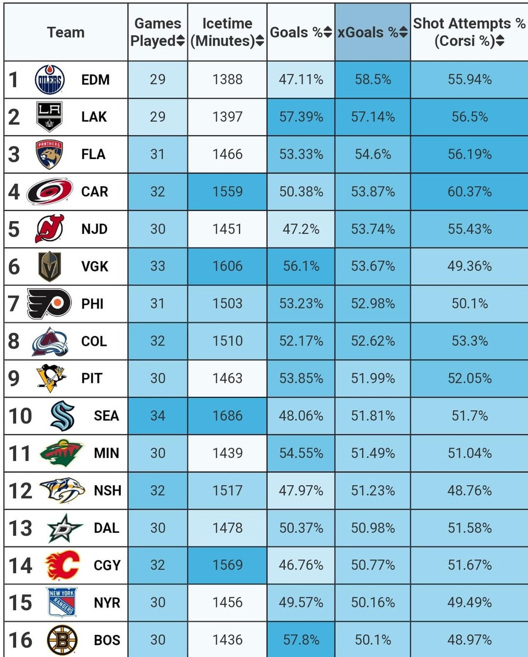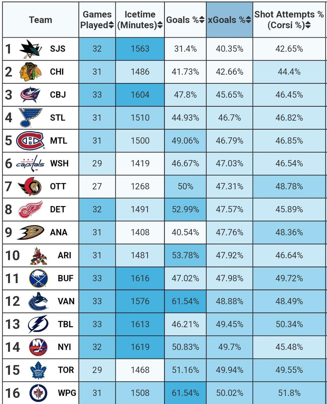 [MoneyPuck] Top and bottom 32 teams in 5v5 xGoals%