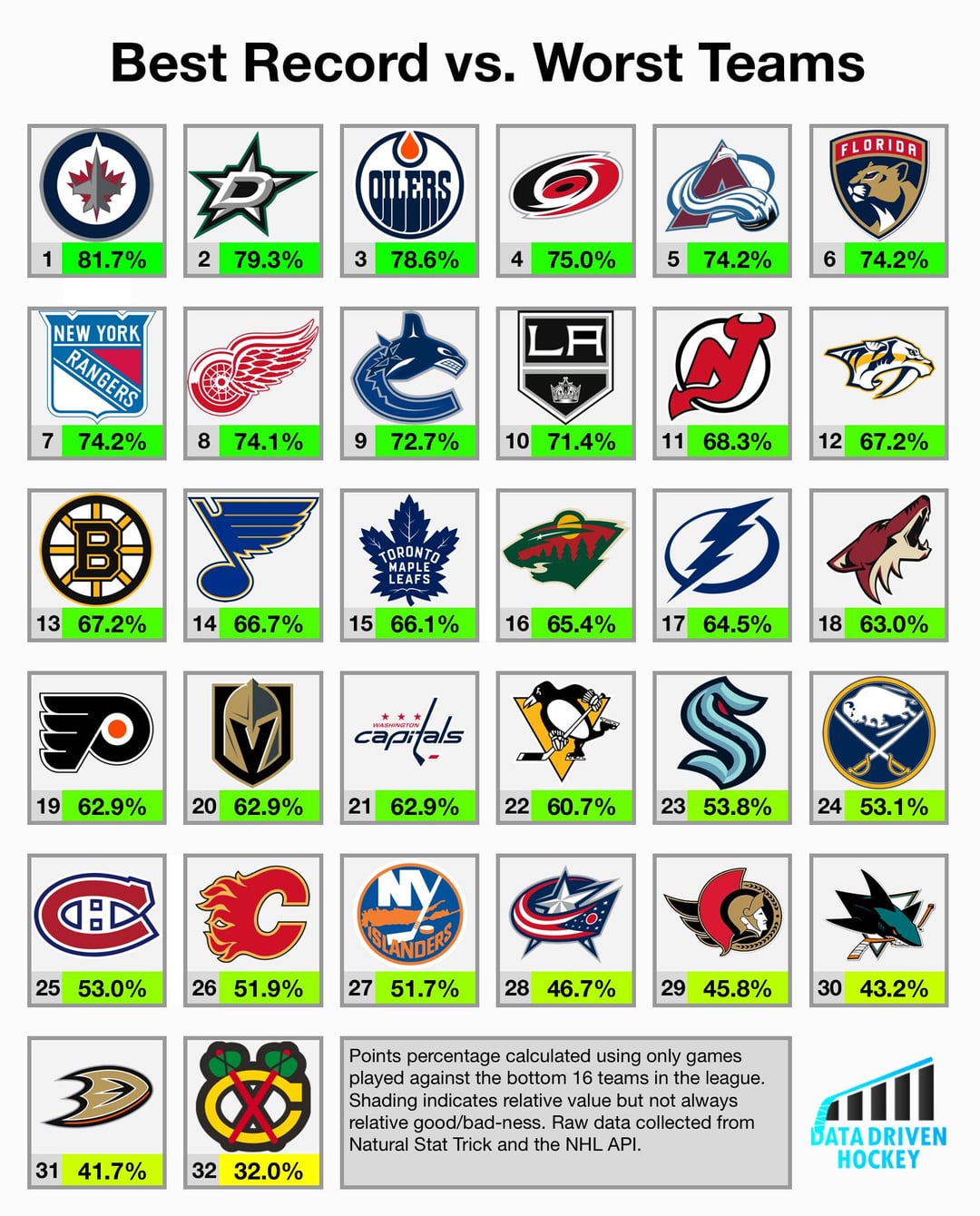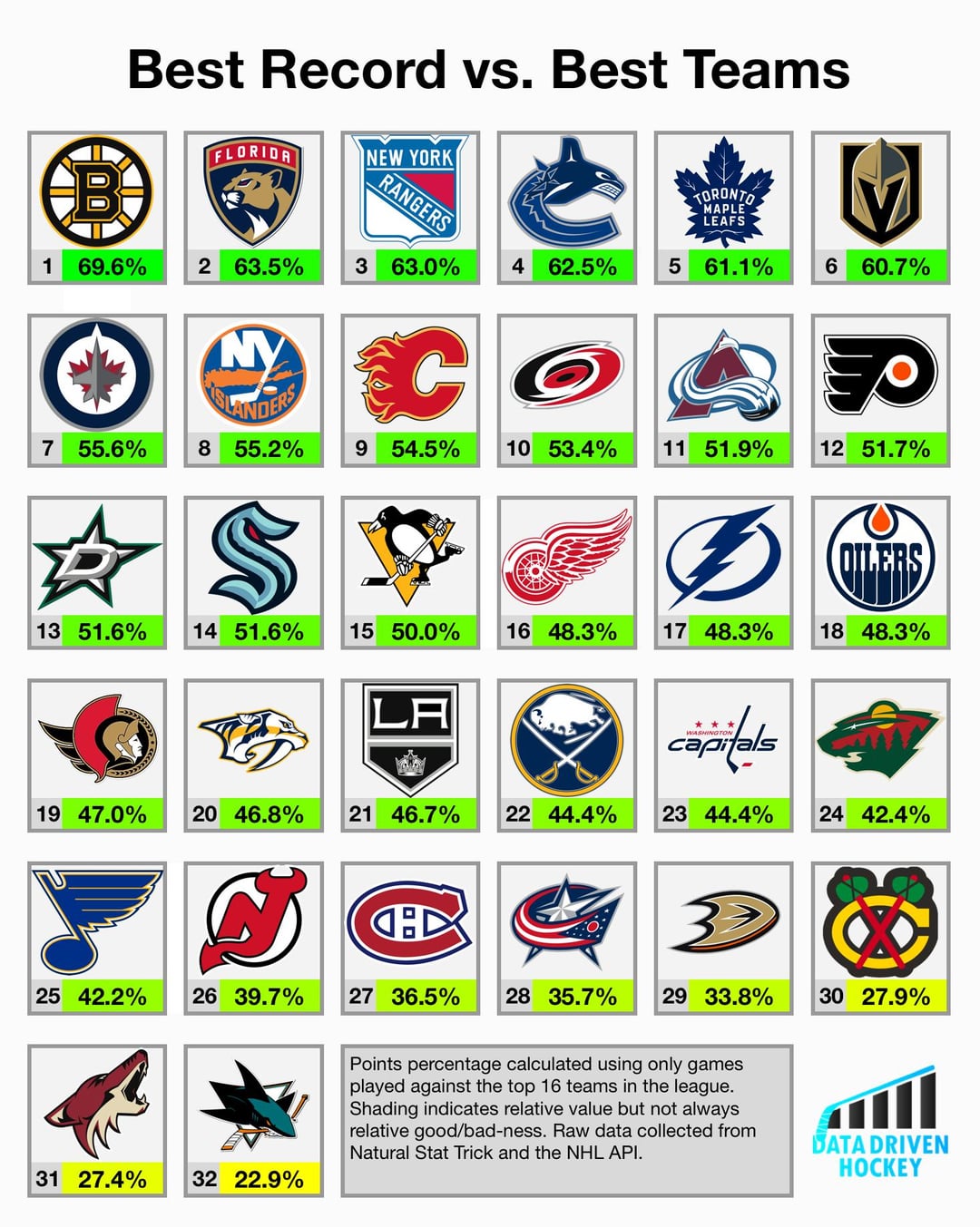 9. Might be interesting to add how many games each team has played in each category. The Atlantic Division currently has 5 teams in the top 16, so teams from that division may have played more games against “best teams”, by facing their divisional oppnents more frequently.