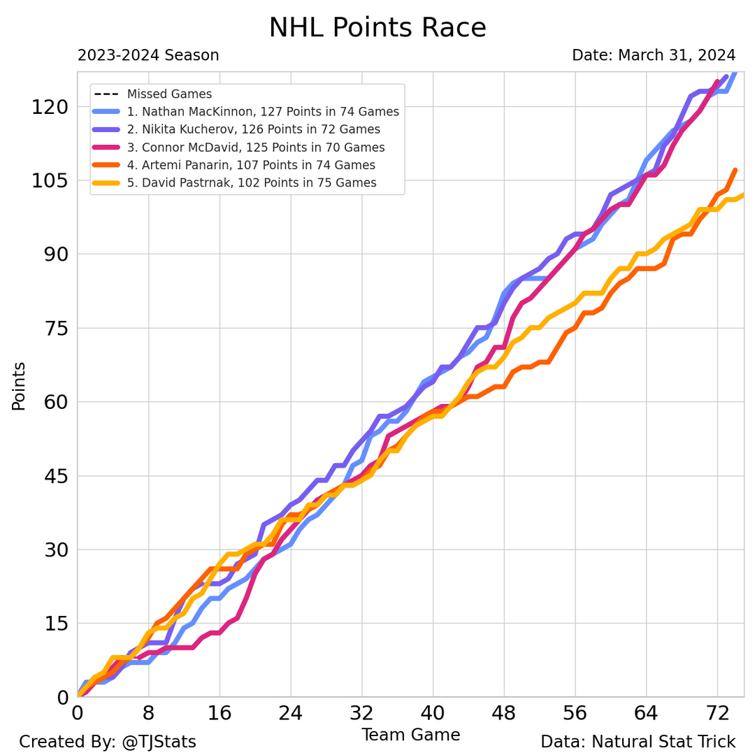 Nathan MacKinnon (127), Nikita Kucherov (126), Connor McDavid (125)
