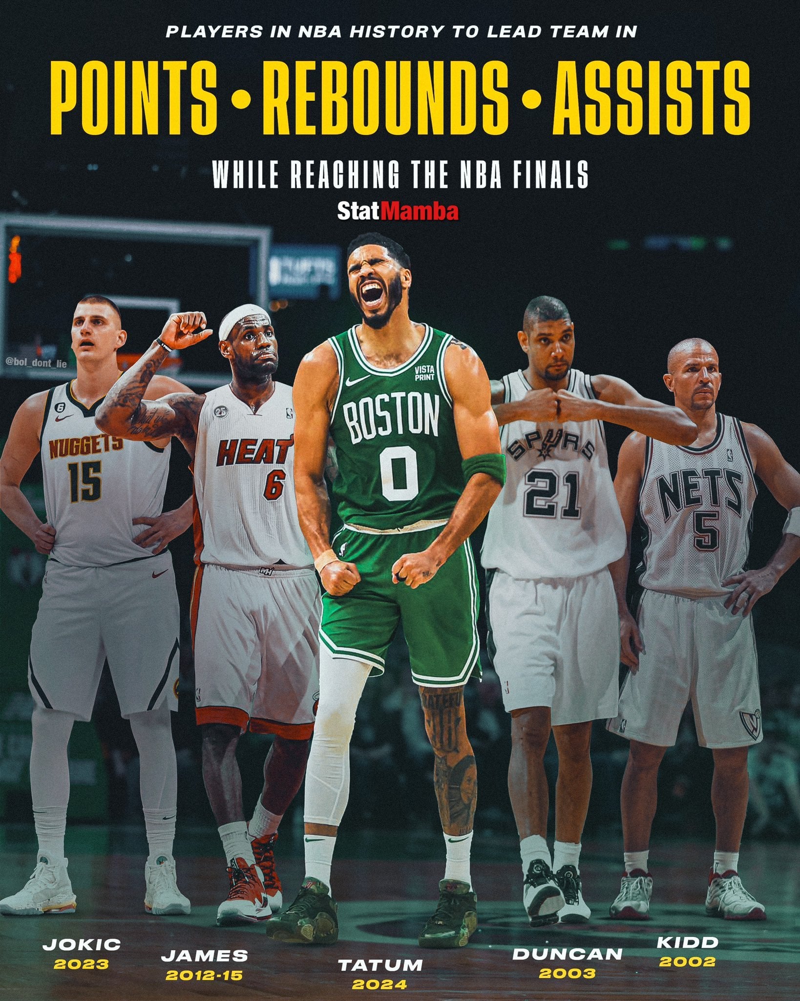 Jayson Tatum is the 5th player in NBA history to lead their team in PTS, REB, & AST while reaching the Finals. 2 comments JB:Whos the alpha dog now? The 6th one is on his way too. Leave a ReplyYou must be logged in to post a comment.