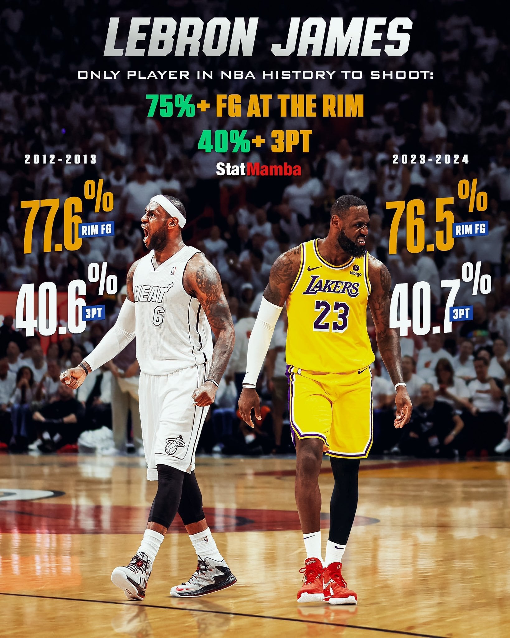 LeBron James is the only player in NBA history to shoot 75% at the rim & 40% 3PT in a season. 5 comments Most complete basketball player of all time and it ain’t close Impressive AF that he did it twice, with the second time being 11 years later. What decline, for real? 76% at the rim is crazy. He might be the greatest finisher ever. LeRecord at it again 😂😂😂 Witness Greatness Leave a ReplyYou must be logged in to post a comment.