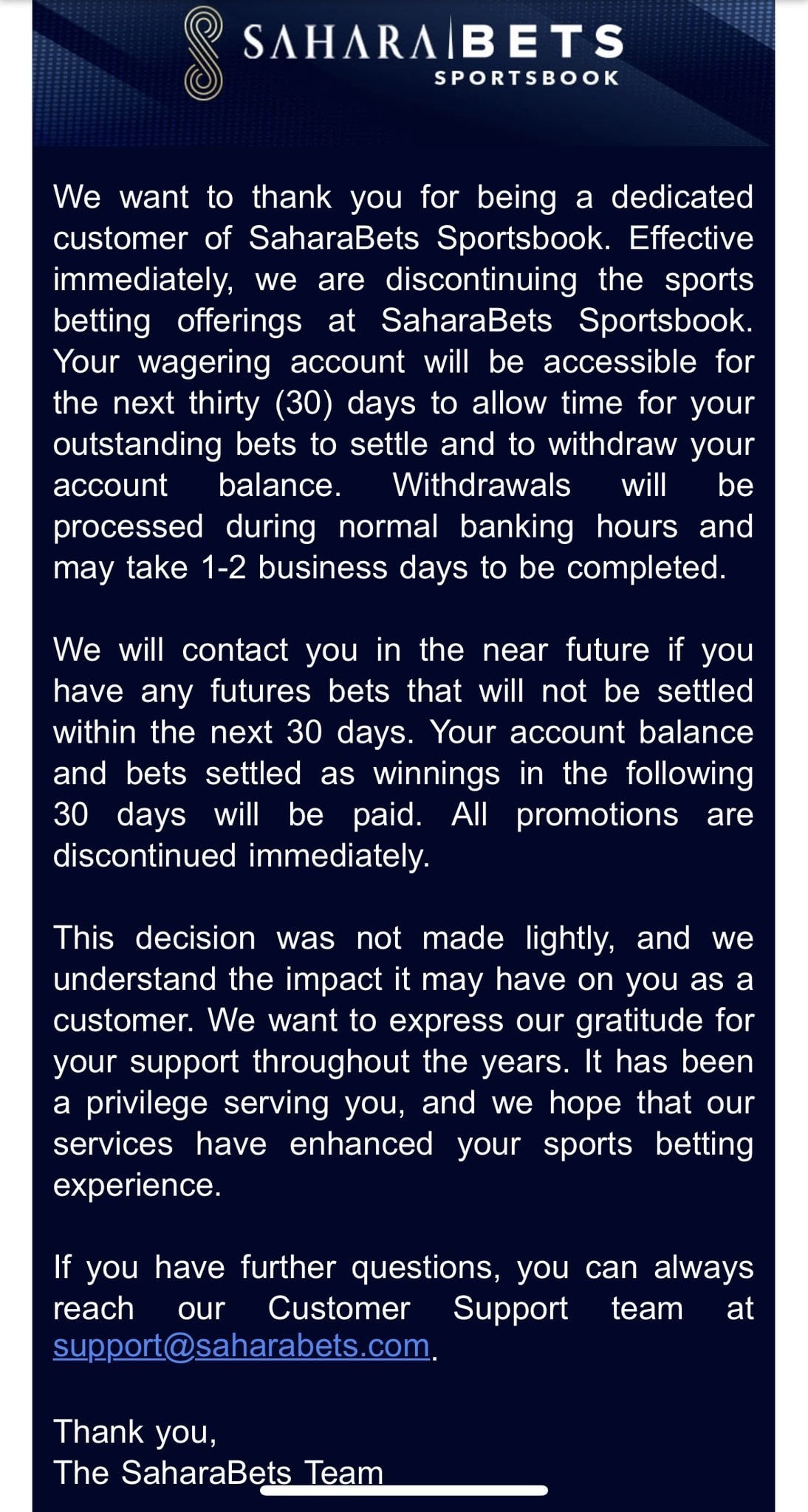[Leah Merrall] “SaharaBets users received this email today. The Meruelo’s Sportsbook is officially discontinuing.” 3 comments Haha 😆 Good, i now hope to never read his name again Did anyone actually use Sahara bets?? I have never heard of a single person using it. Is the final payout going to be $.50 on the dollar? Leave a ReplyYou must be logged in to post a comment.