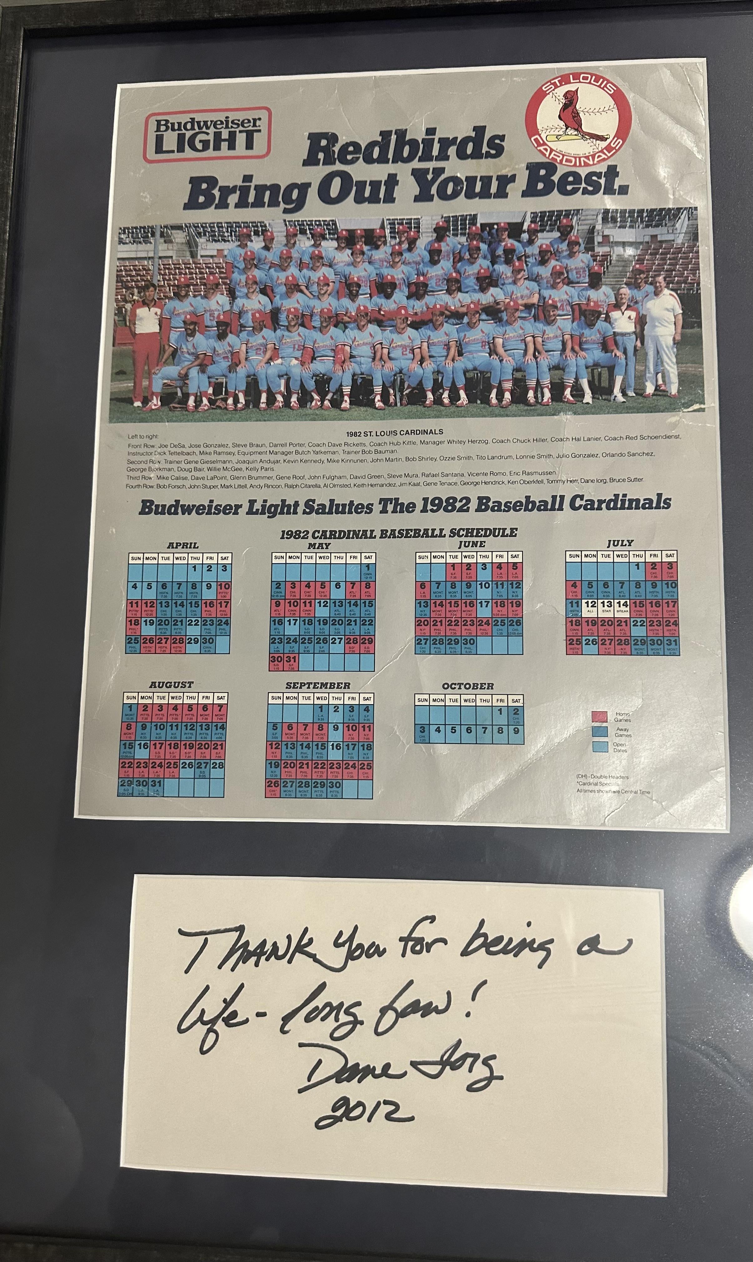I was a kid living in St Louis in 1982. They were my favorite team – my wife had this schedule I had kept framed and had Dane Iorg (she knows his niece) sign a note Just wanted to share 1 comment Damn! Thats awesome!!!! Leave a ReplyYou must be logged in to post a comment.
