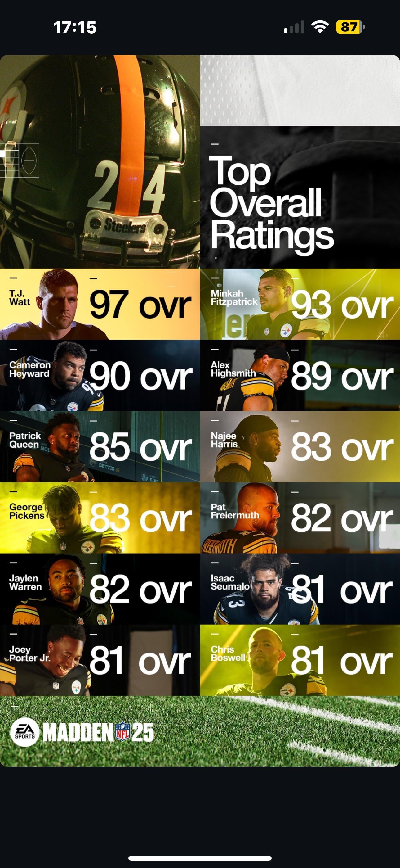 Pickens is talented but due to the last couple yrs and a lot of uncertainty still I understand his rating. Najee and Warren should probably be a couple ticks higher, and I think they should have the same ovr, if anything Warren seemed to be the more successful back last year(idk about numbers, but seemed more productive to me)… tj is underrated but 97 is damn high so I can’t complain, he should have the best ovr at his position, worst case should be even with miles Garrett(even though tj is fucking better)… Minkah has been a little off and 93 is understandable, he’s an elite talent who came off and cooler year than usual. Cam is old, 90 makes sense to me. Patrick Queen should probably be a point or two higher, always thought he was good and intense.