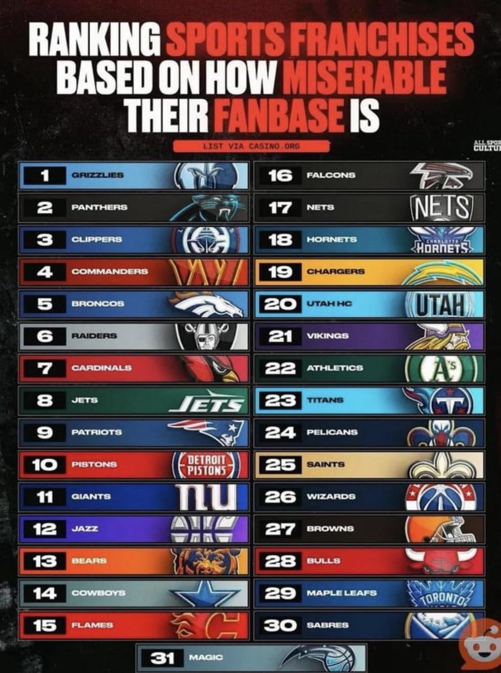 The falcons are top 5 all time across all leagues and it’s not even close. Strong argument for #1. Between the 98 superbowl blowout, 2012 nfc championship, 28-3, and all the shit season in between, we are completely fucked in the head as a fan base
