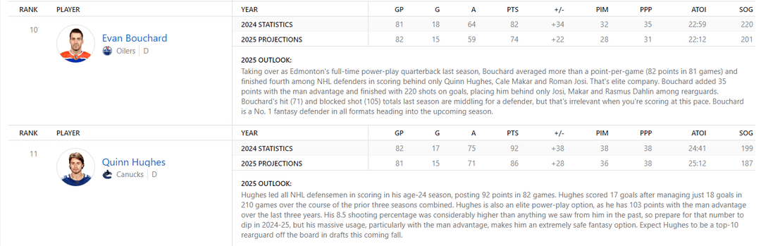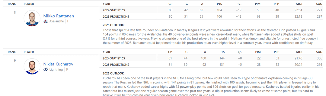 ESPN fantasy rankings have Matthew Tkachuk over Connor McDavid, Josi over Makar, Rantanen over Kucherov, and Bouchard over Quinn Hughes.