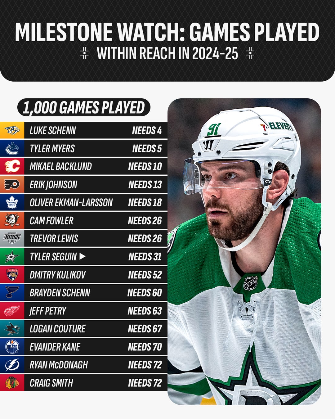 Seguin needs 31. Craig Smith needs 32. Sad Smith isn’t still with Stars for this. Good luck to both!! Suter too! 56 more for 1500 games!! What a beast!