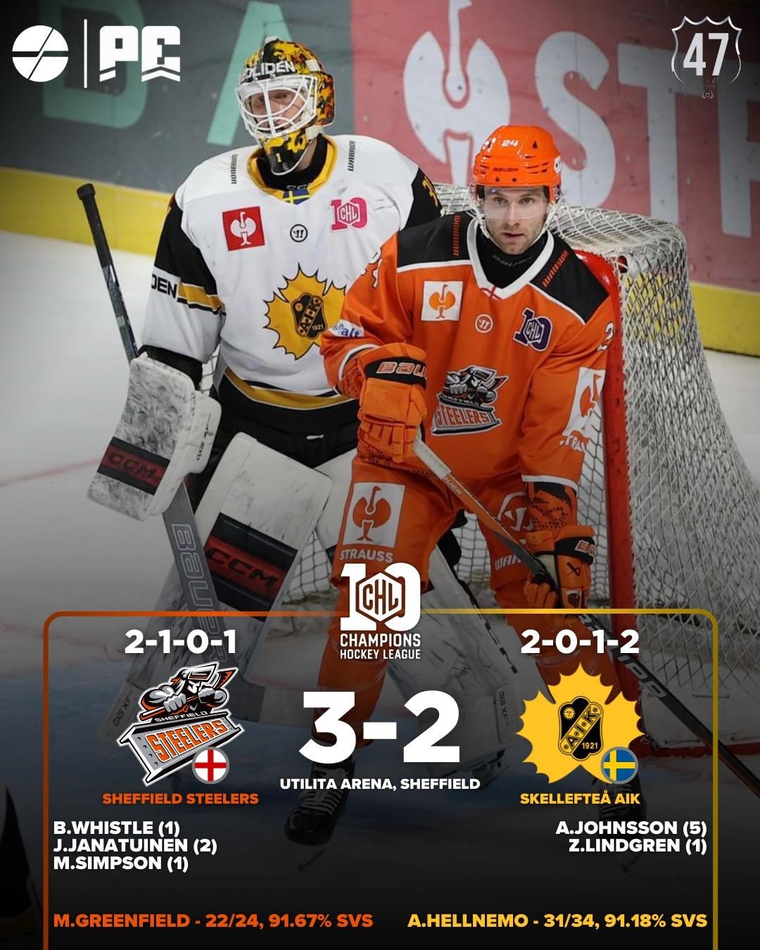 CHL🇪🇺 the Sheffield Steelers (🏴) upset their biggest match against the reigning Swedish Champions Skellefteå