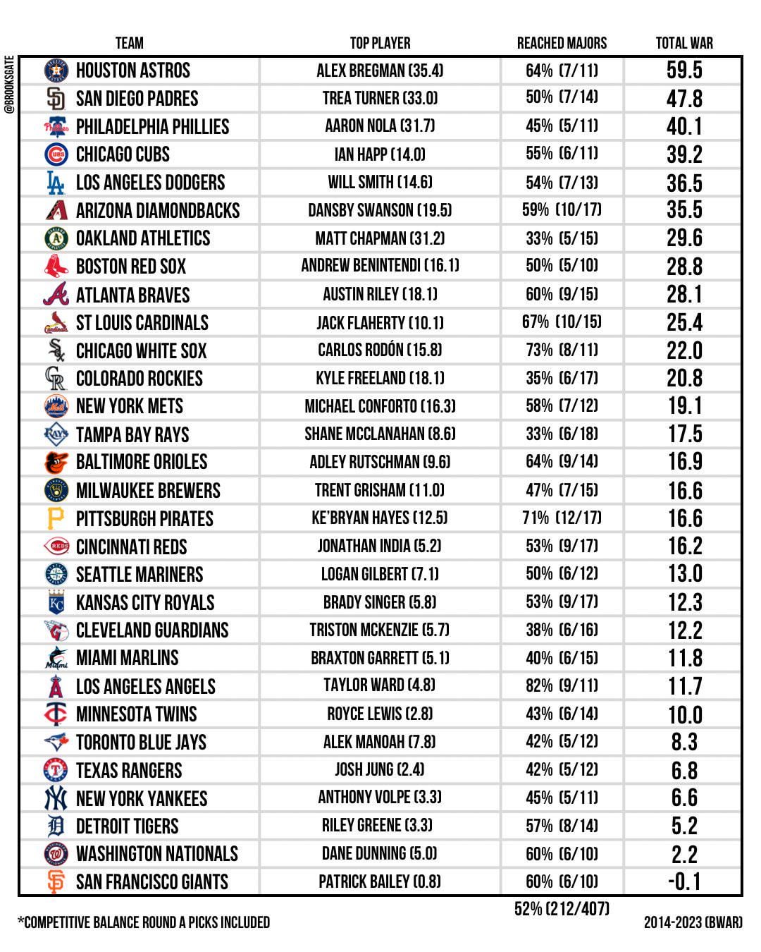 The total WAR of every team’s 1st round picks the last 10 years 13 comments Heliot’s 2024 will alter this. The Giants have gotten 6+ fWAR out of Bailey and Ramos this year. 10 years? Seems like the problems started before Farhan’s tenure, no? bWAR is going to make the Giants look worse mostly because Bailey is an fWAR merchant which is a good thing because fangraphs grades catchers better. Oh. My. God. This game is all about offense now yet the giants want an automatic out behind the plate because he can frame good? Damn dude I know we didn’t make the playoffs why do you have to pull up stats from last year? Bryce Eldridge about to boost this cellar dweller team Man, that Conforto player must be good. Maybe we should offer him a contract when he’s a free agent How is singer ahead of Witt?? But but but… JoEy BaRt iS hAvInG a BrEaKoUt YeAr iN PiTtSbUrGh!! 🥴 SF There’s (literally) nothing like it! A few recent WS champs near the bottom of the list Leave a ReplyYou must be logged in to post a comment.
