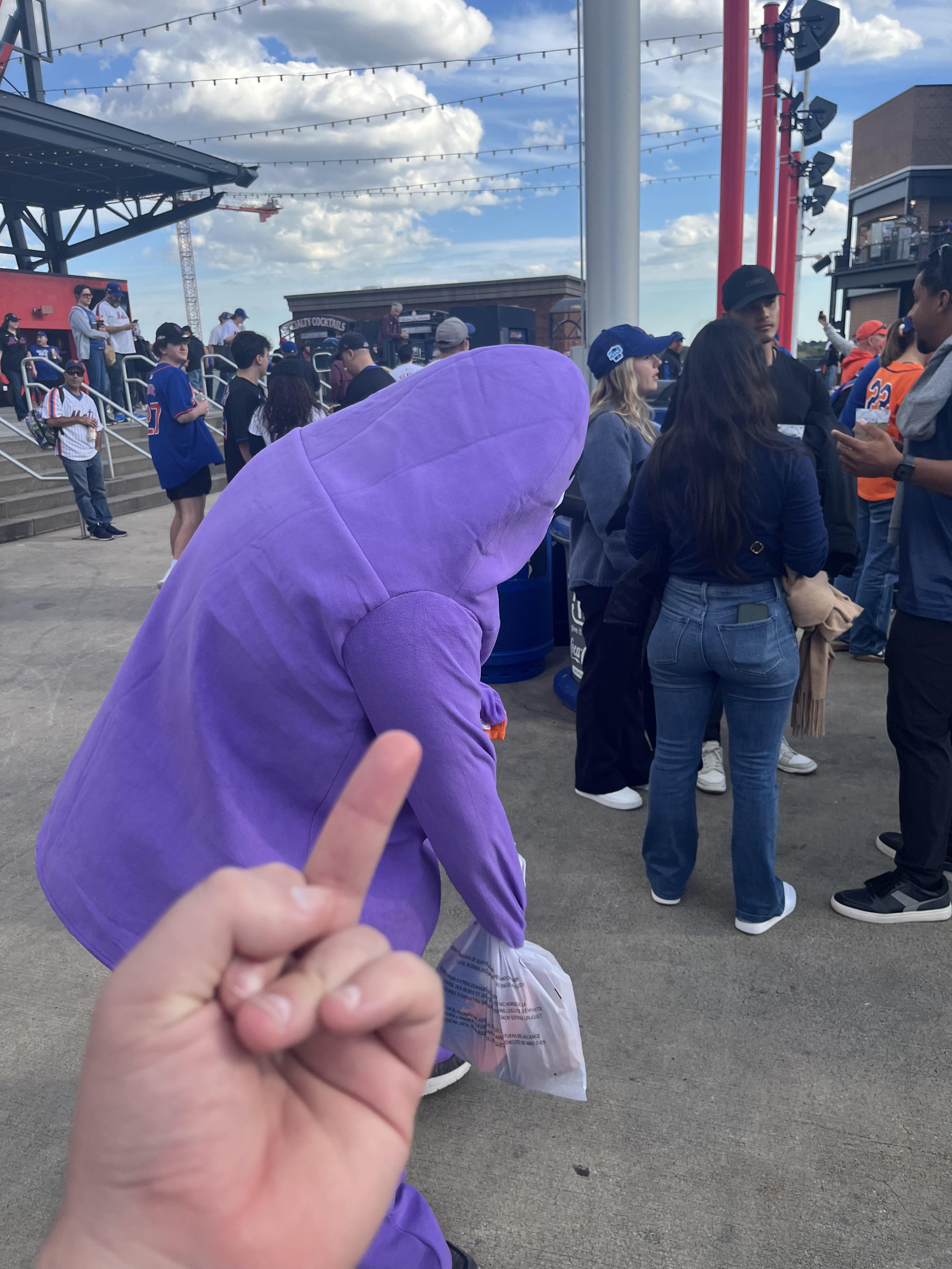 Go Phils. Fuck the Mets. Grimace eats ass. That being said, I really hate when someone takes a photo of themself giving someone who’s not looking the middle finger. Just seems weak. Carry on.