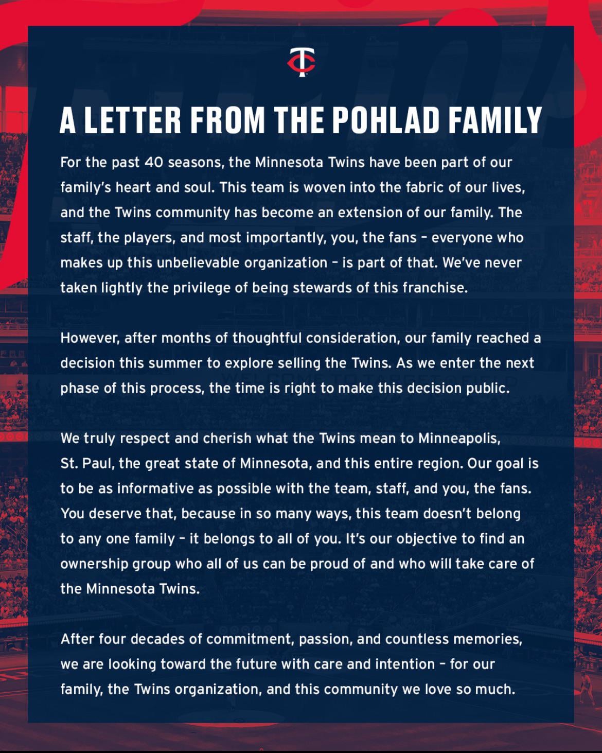 [@Twins on X] The Pohlad family’s statement on today’s news: