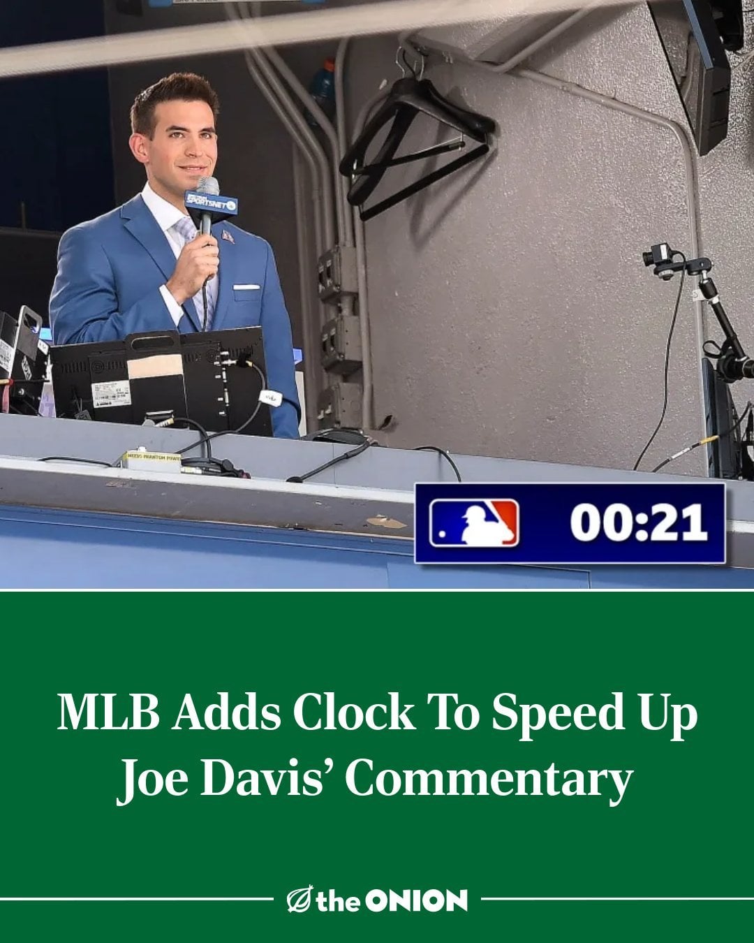 [The Onion] MLB Adds Clock To Speed Up Joe Davis’ Commentary 2 comments Still can’t believe we were stuck with that puke for the series This popped up right above the baseball post of it and my eyes skipped over the onion part of it had to triple check lmao Leave a ReplyYou must be logged in to post a comment.