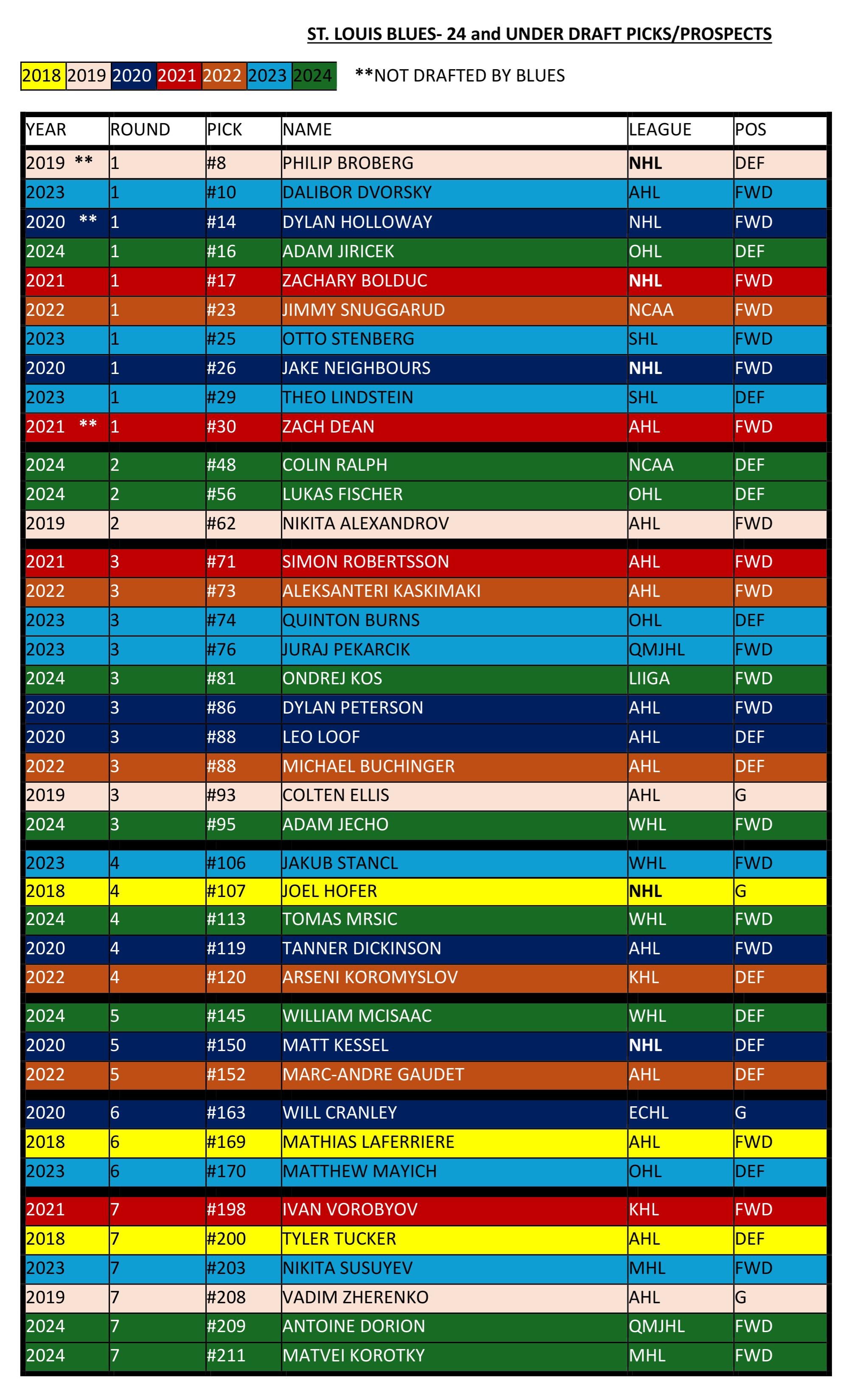 I got bored, so I put together a chart with the blues 24yo and under drafted players/Prospects/players traded for. They’re sorted by overall draft position. If I made any errors, missing someone, or you have suggestions to make it better, let me know.