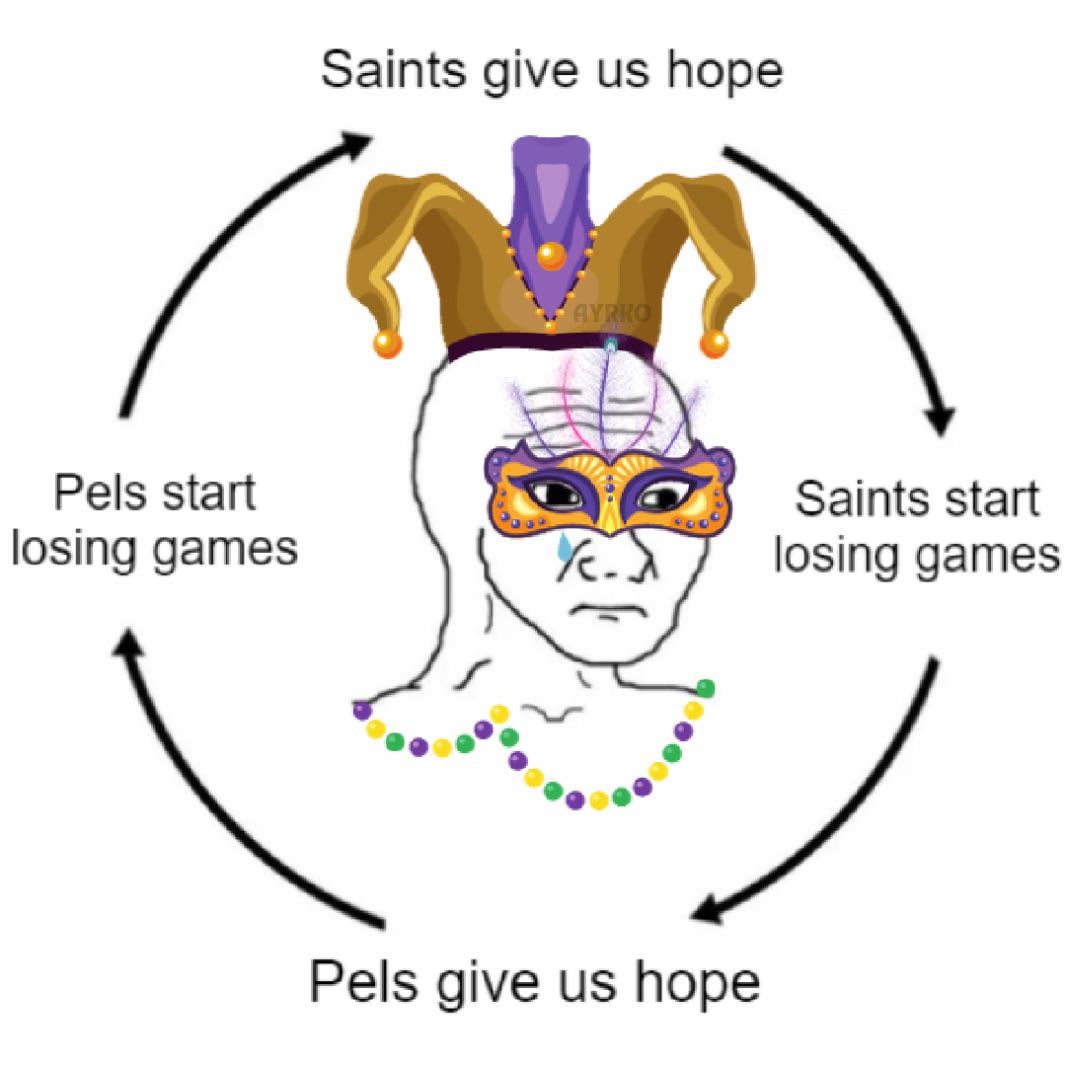 ‘Round and ‘round we go. 3 comments The real cycle is that neither of them are good enough to be contenders but also not bad enough to bottom out. So…we just say in this suspended animation of disappointment You had hope for the Pels? That’s your first mistake bucko. Saints are back! Pelicans should be back soon when we get our entire team back. Leave a ReplyYou must be logged in to post a comment.
