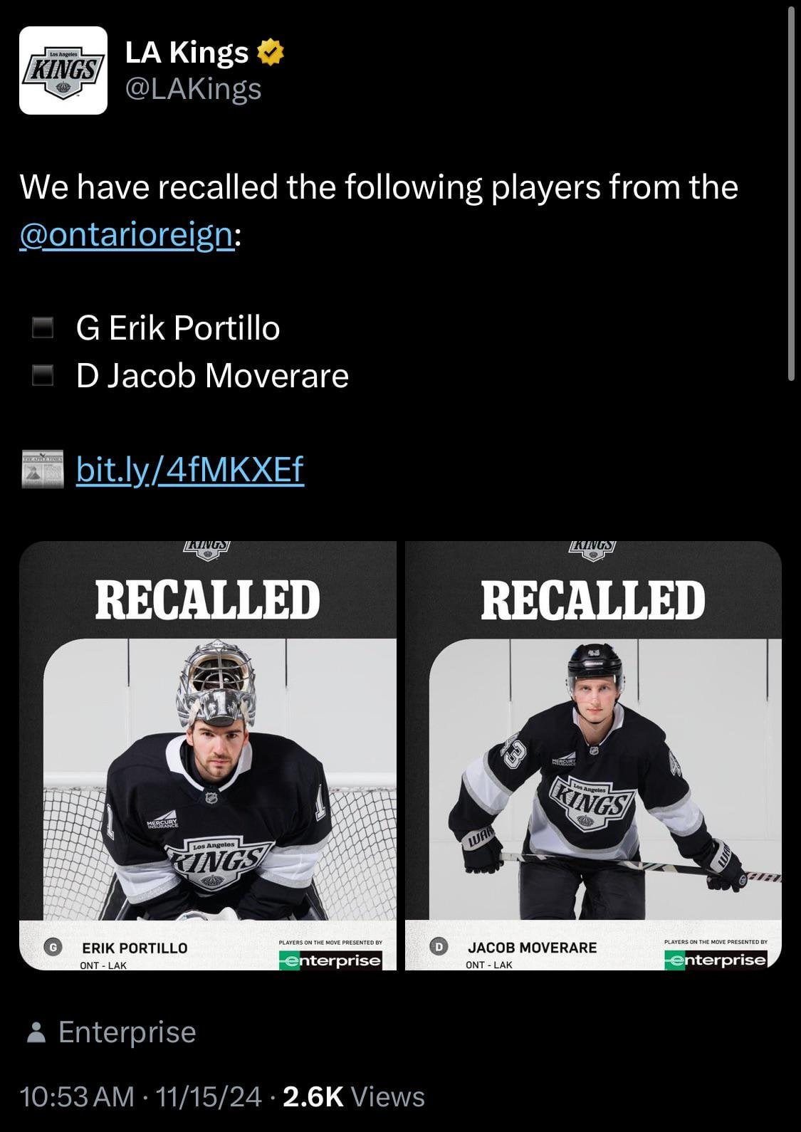 | 109 | 31 comments | Kings recall Erik Portillo & Jacob Moverare from Ontario Reign |