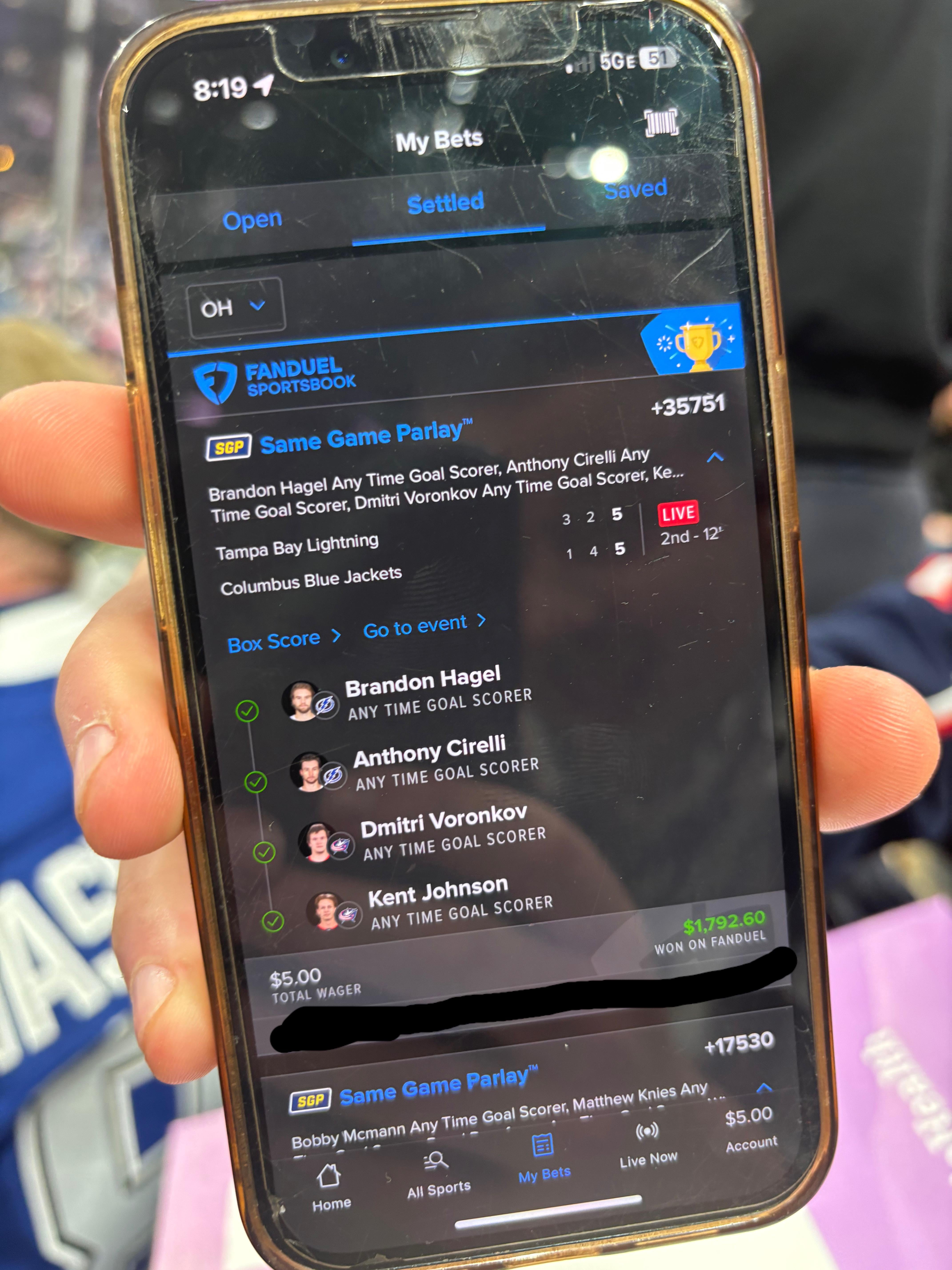 Gentleman I was sitting next to at the game tonight hit this crazy bet. 5 comments I’m pretty big against sports betting but DAMN Tonight was a good night for an Anytime Goal Scorer parlay! Cash that out ASAP lol Cool, bet he’ll still be down life-time. Betting is dumb. Enjoy the sport. Cool. Now show me the 450 bets he lost. Leave a ReplyYou must be logged in to post a comment.