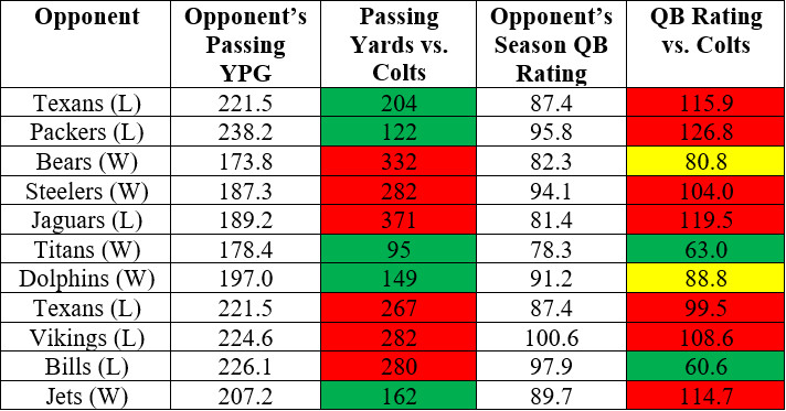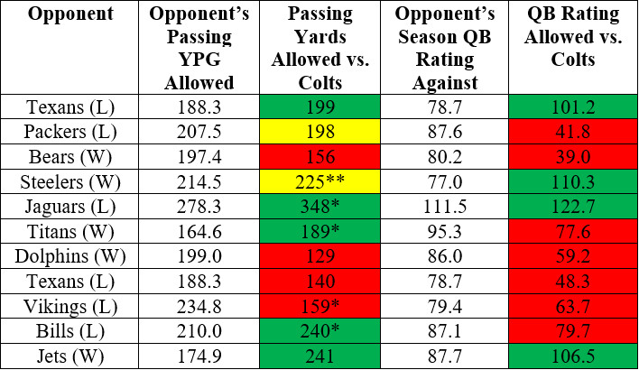 It hasn’t been a great year for the Colts’ pass defense, but it hasn’t been all bad. Though they’ve allowed six of 11 opponents to eclipse a passer rating of 100, they’ve also held four below 90. Still, teams are regularly eclipsing their averages against this unit.