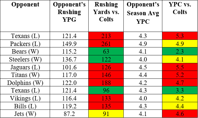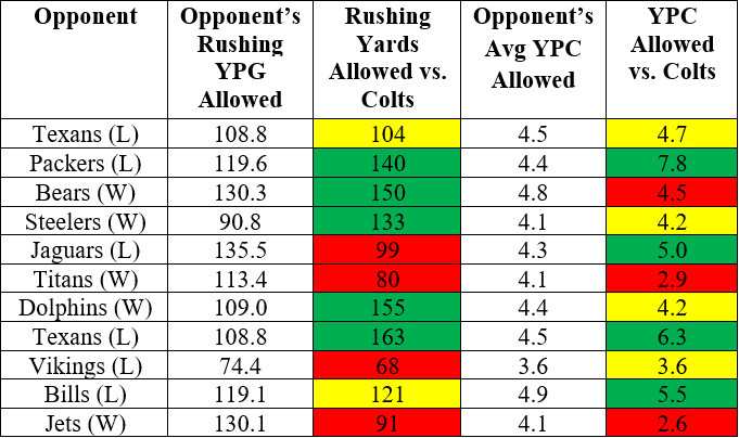 Well, this is a mess. There’s no pattern, no consistency, no trends to pick up here. Sometimes the Colts run game is really, really good—like their 163 yard performance against that Texans run defense. Sometimes it’s terrible, like picking up 68 rushing yards against the Vikings two weeks ago.