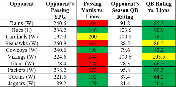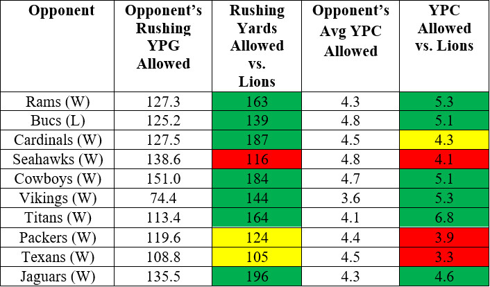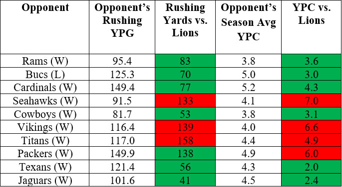 No team has yet to hold the Lions under 100 rushing yards, and they’ve now eclipsed 160 yards in five of 10 games. The only team to really hold them in check was the Texans, and by the end of the game, the Lions had worn them down, too.