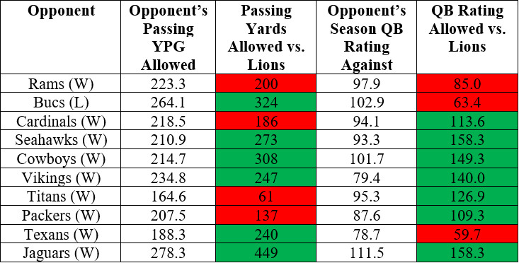I’ve mentioned multiple times in this section that I’ve been at least a little skeptical of Detroit’s success here, as it appeared heavily dependent on interceptions, which could be tough to maintain all year. Well, not only have they maintained that by catching at least one interception in every game this season, but the other statistics are starting to slide into their favor as well.