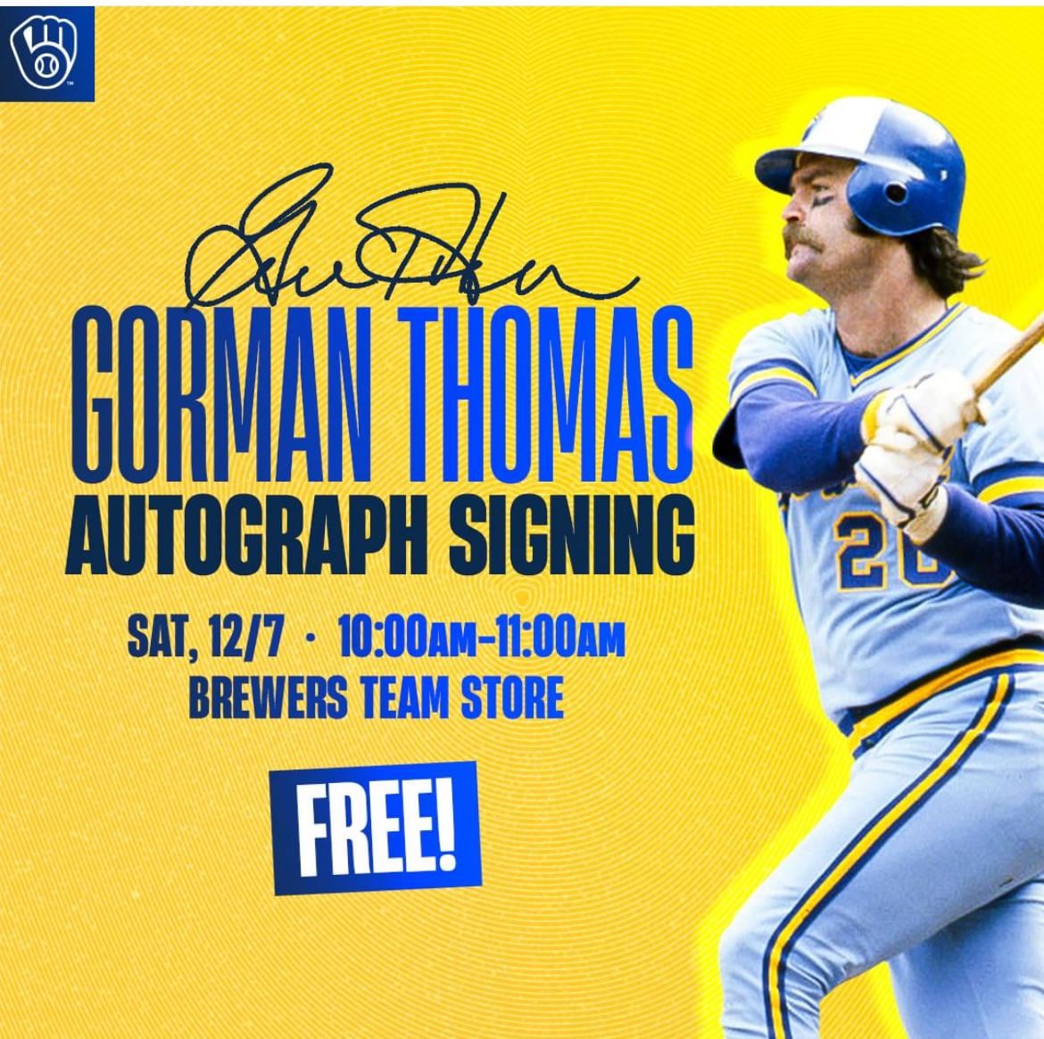 Gorman Thomas will be doing free autographs at the team store during the clubhouse sale.