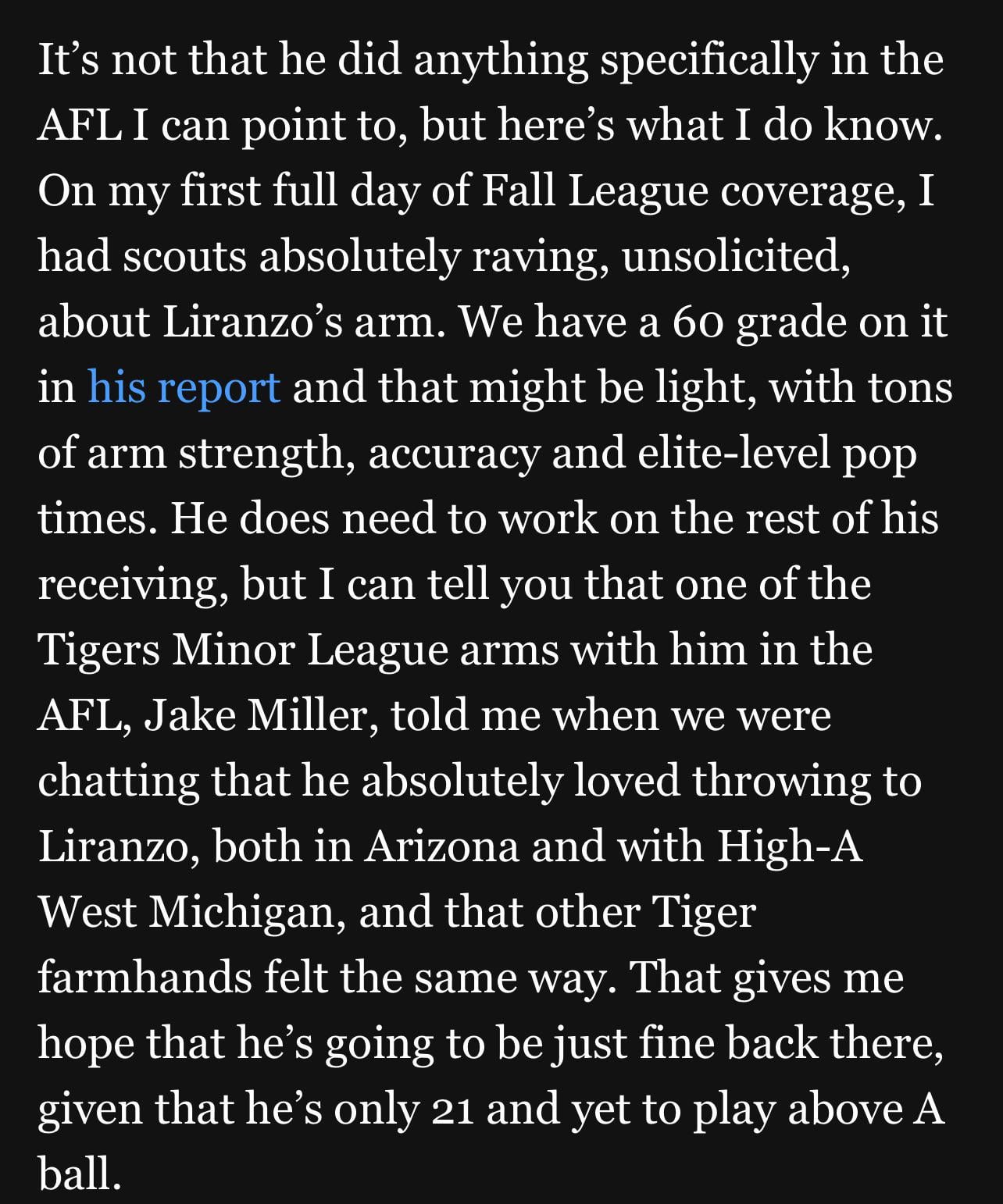 I love our catching depth down there. It is wild right now. Briceno least likely to stick at the position but still a possibility, Jimenez the furthest away (2.33 years younger than Liranzo) but still hitting well at 1.3 years younger than the average FCL guy, both Briceno and Liranzo with the ability to hit well enough to move to first base without costing us anything at the plate, both Liranzo and Jimenez switch hitting and potential plus contributors in the field behind the plate…