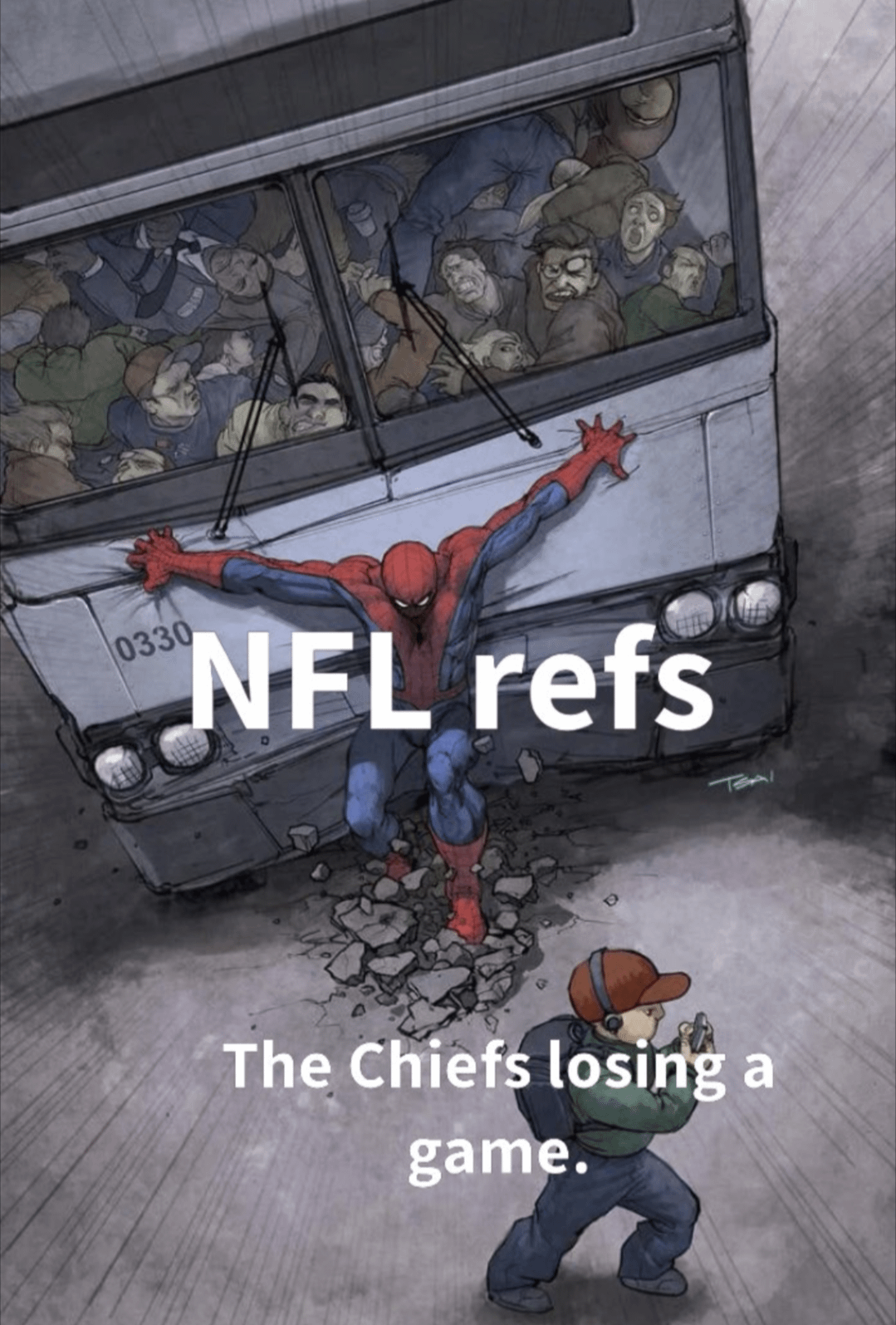 True 7 comments The Chiefs after playing Josh Allen and the Bills:  You’re like 24 hours late I want to see a game chiefs vs any team no refs and see the scores  Lol Chiefs win because the Raiders fucked up hard, but sure, give the refs credit A second game* Go Bills! The people in the bus: every other team’s fanbase Leave a ReplyYou must be logged in to post a comment.