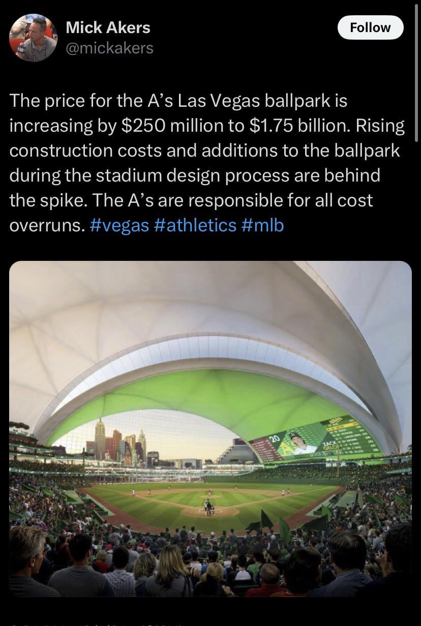It’s almost like they should’ve just taking down mount Davis and revamped the plumbing in Oakland. Much cheaper to do that when The city isn’t bending over for you.