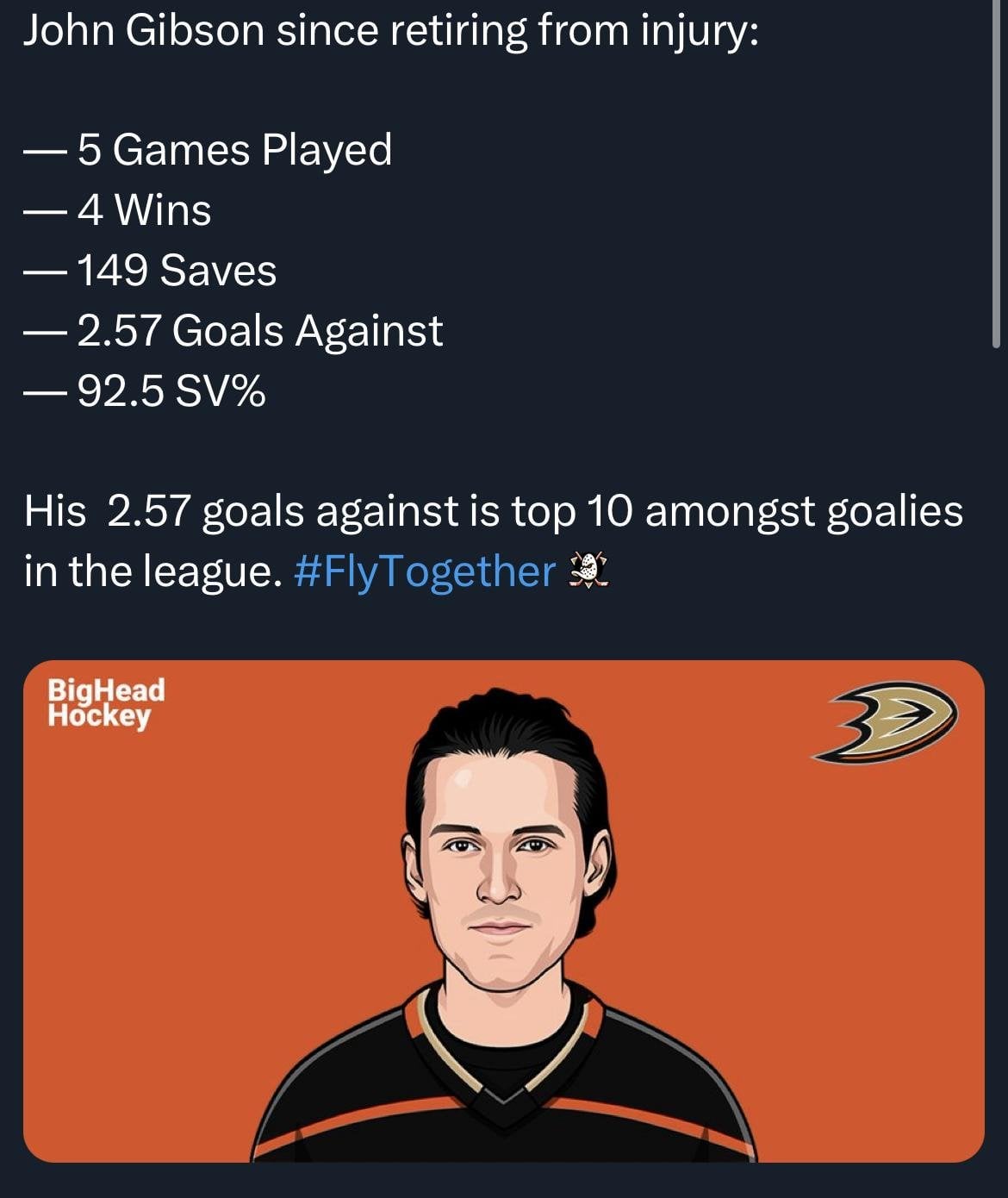 | 201 | 28 comments | John Gibson proving he’s still got it. Currently 4-0-1 in regulations games |