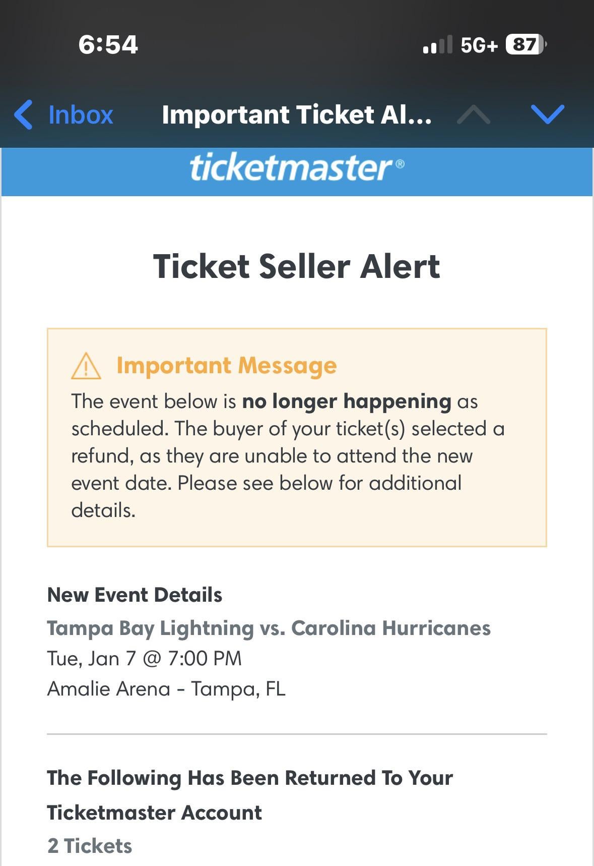 2. It’s still showing up on the Lightning website. Maybe the buyer of the tickets can’t make the new date of 1/7 and Ticketmaster gave them the option of a refund.