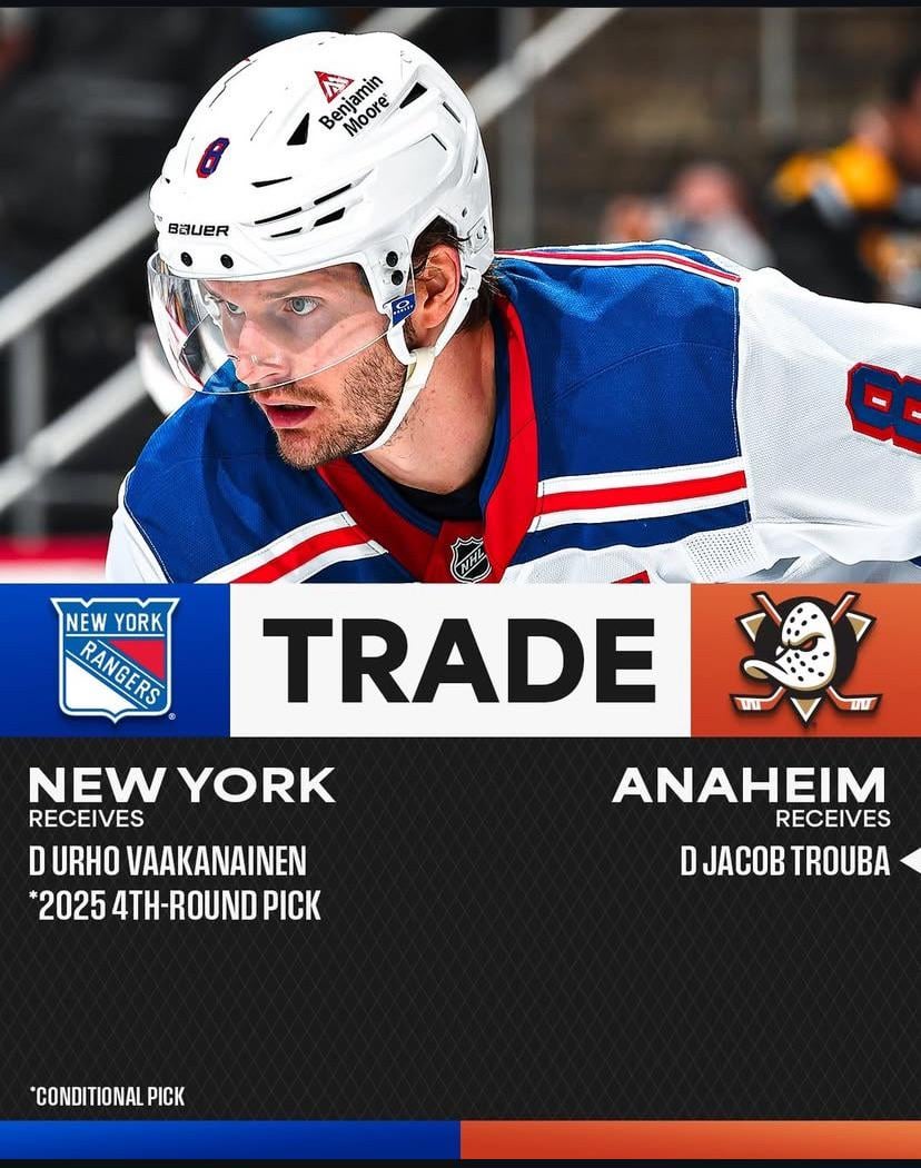 People on this sub think we need to add value to dump Dougie and then things like this happen. The Rangers should be paying the Ducks a first per year for the rest of Trouba’s contract to compensate for his negative value. What a terrible trade