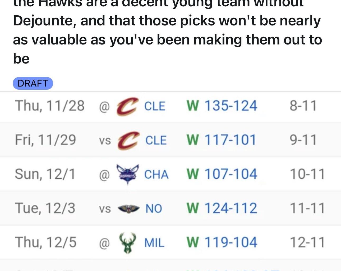 The amount of copium in that thread got me crying. Mf said once Trae misses his “customary” 20 games, it won’t be the same situation. Who’s going to tell him that he’s putting up these numbers on a bum Achilles rn AND has never missed the amount of games in his career as he did last season 😂